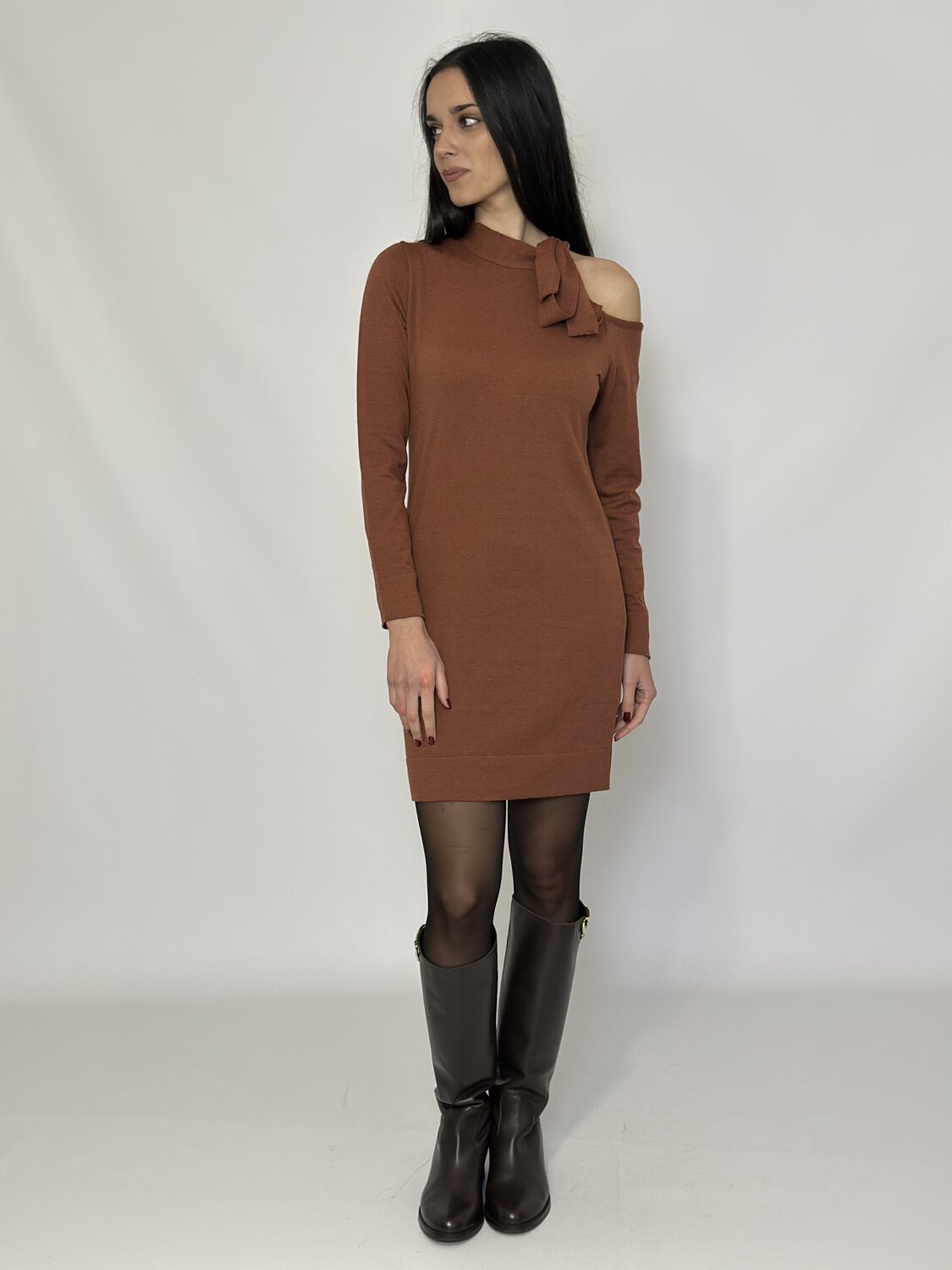 Abito Maglia Fiocco Terracotta di Vicolo. Abito corto in maglia con maniche lunghe e vestibilità aderente. Dettaglio cut out sull spalla e fiocco sul collo laterale. Taglia unica. Disponibile in terracotta, nero e verde scuro.