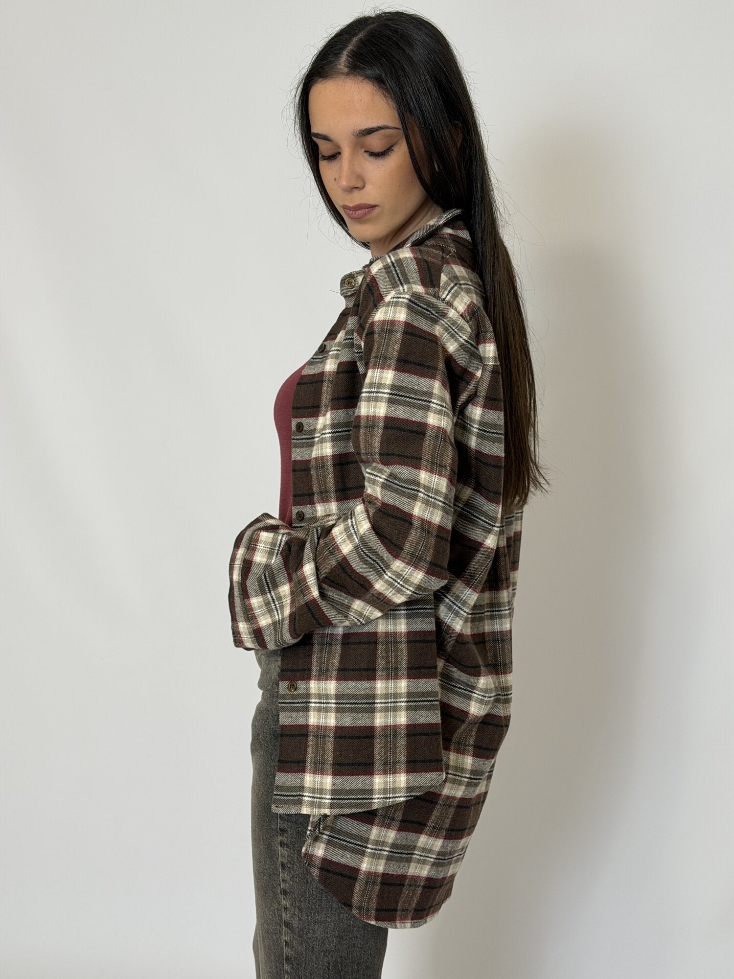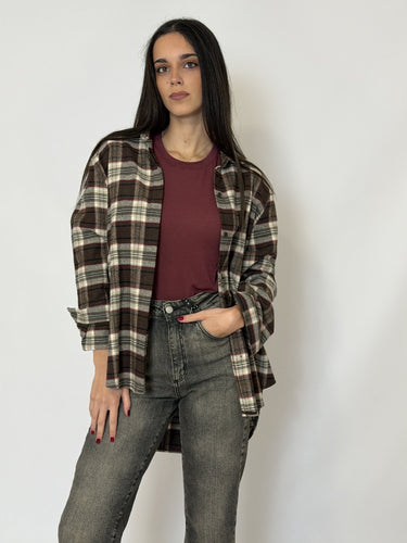 Camicia oversize in flanella a quadri moro bordeaux di Haveone. Camicia con vestibilità oversize e rilassata. Tessuto flanella a fantasia a quadri/check. La fantasia è nei colori moro, panna, bordeaux e nero. Dettagli di colletto classico, abbottonatura frontale e maniche lunghe.