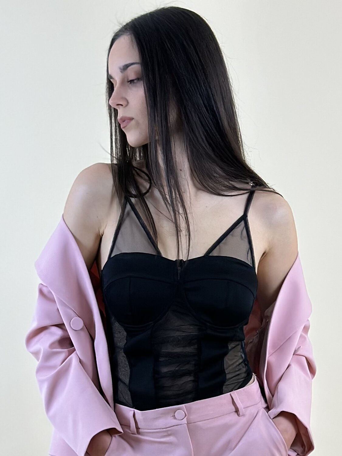 Corsetto in tulle e satin nero di Vicolo. Corsetto in tulle con bretelle regolabili con corpetto in viscosa e chiusura sul retro con gancetti. Disponibile nel colore nude e nero