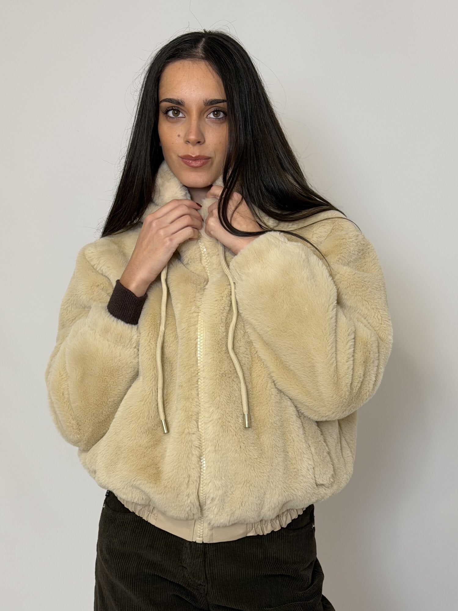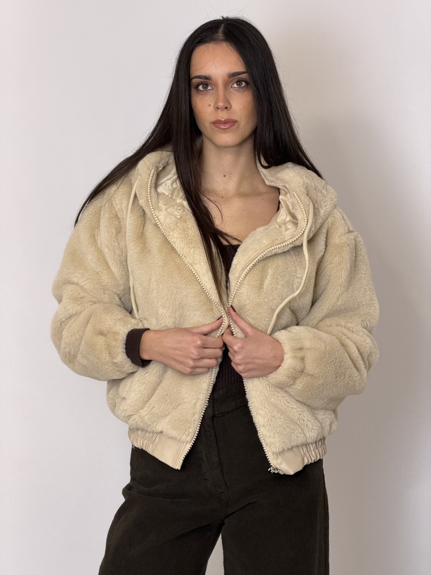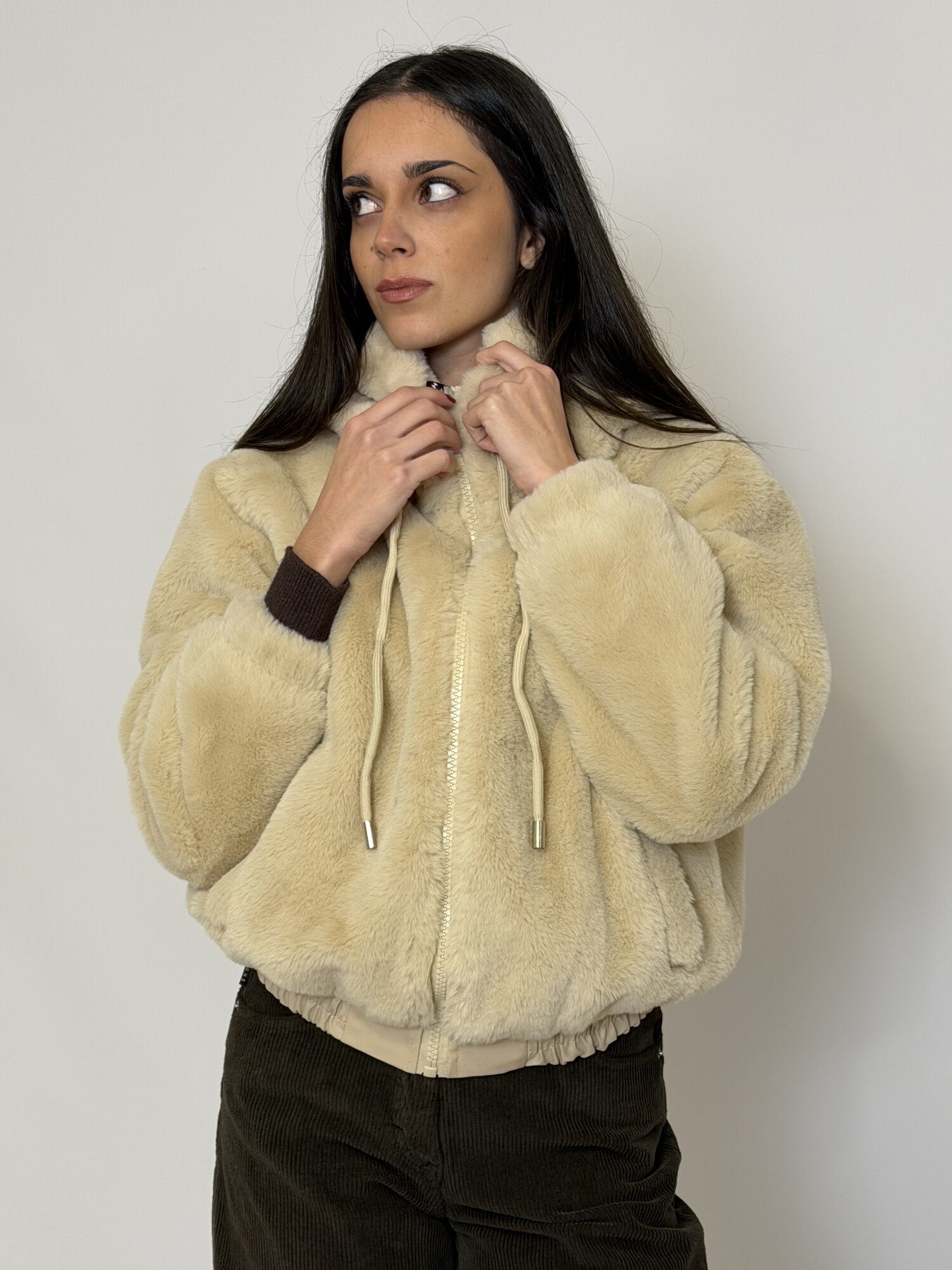 Ecopelliccia Cappuccio Beige Chiaro di Haveone. Bomber in ecopelliccia con cappuccio. Elastico in vita e chiusura con cerniera frontale. Tasche oblique frontali. Disponibile in beige e cammello.