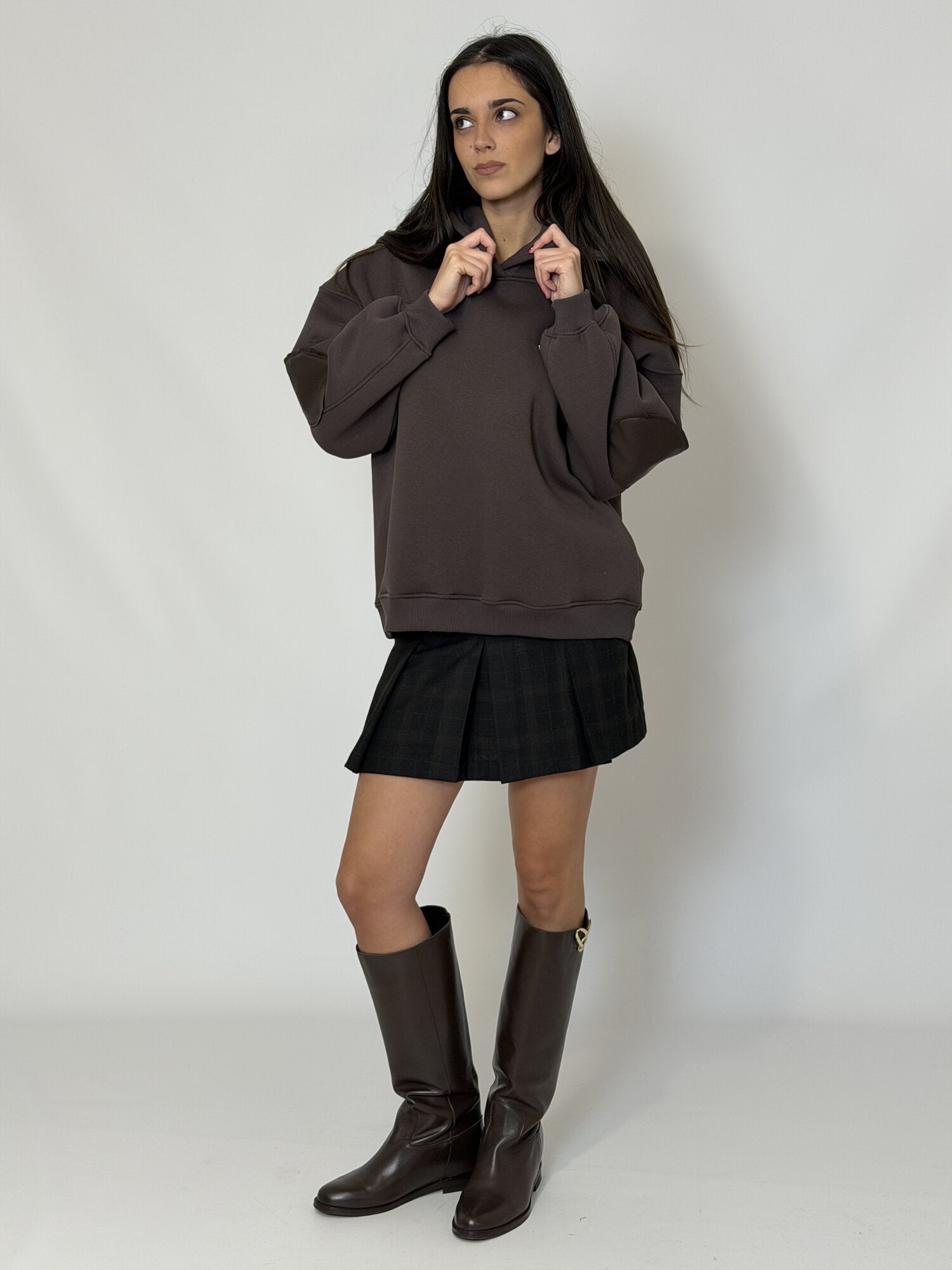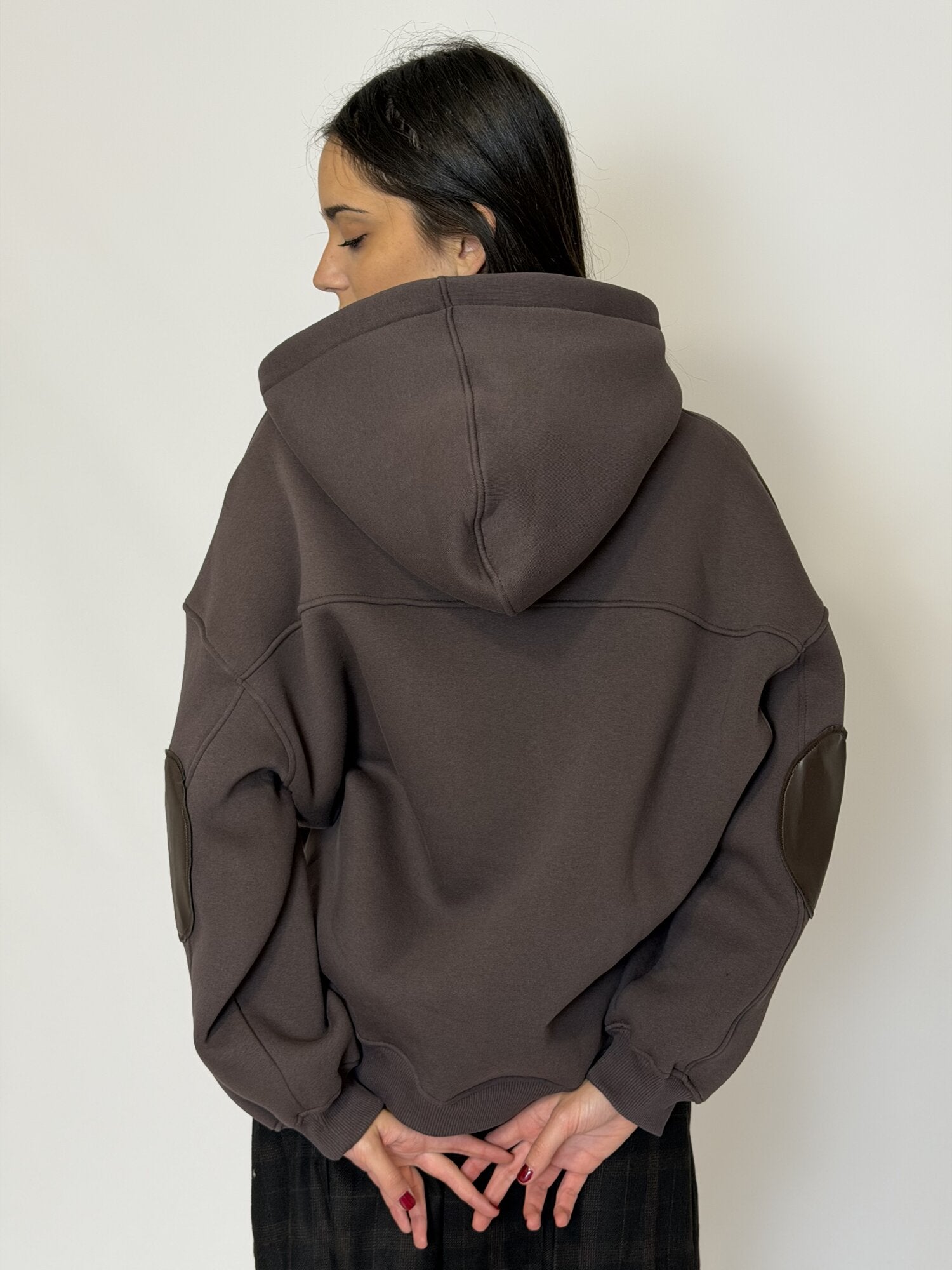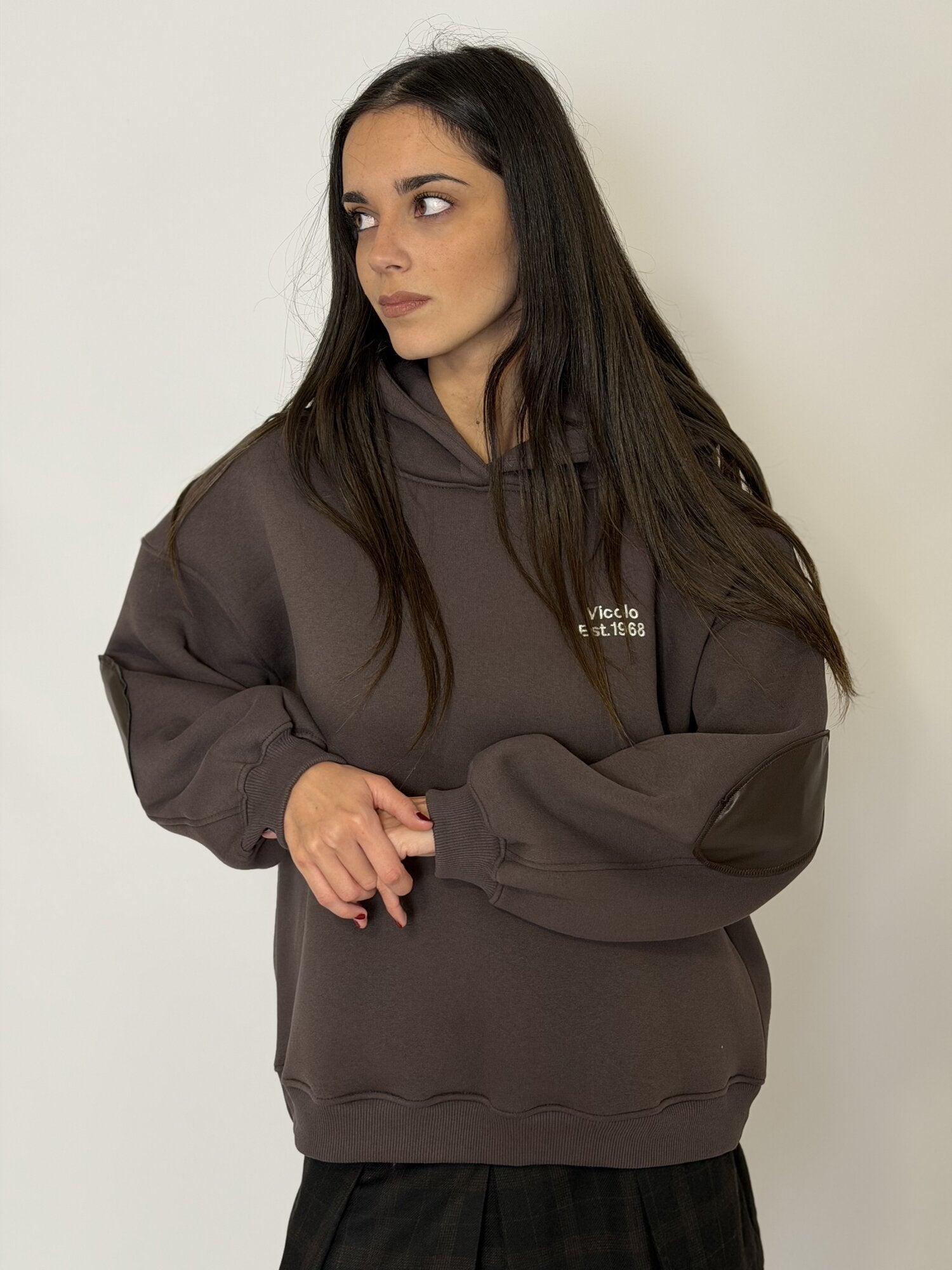 Felpa con cappuccio oversize marrone di Vicolo. Felpa con vestibilità oversize e rilassata. Cappuccio e maniche lunghe con polsini elastici. Piccola scritta/logo "Vicolo Est.1968" ricamata in contrasto sul petto. Toppe ecopelle color moro sui gomiti. Disponibile nel colore blu notte, panna e marrone.