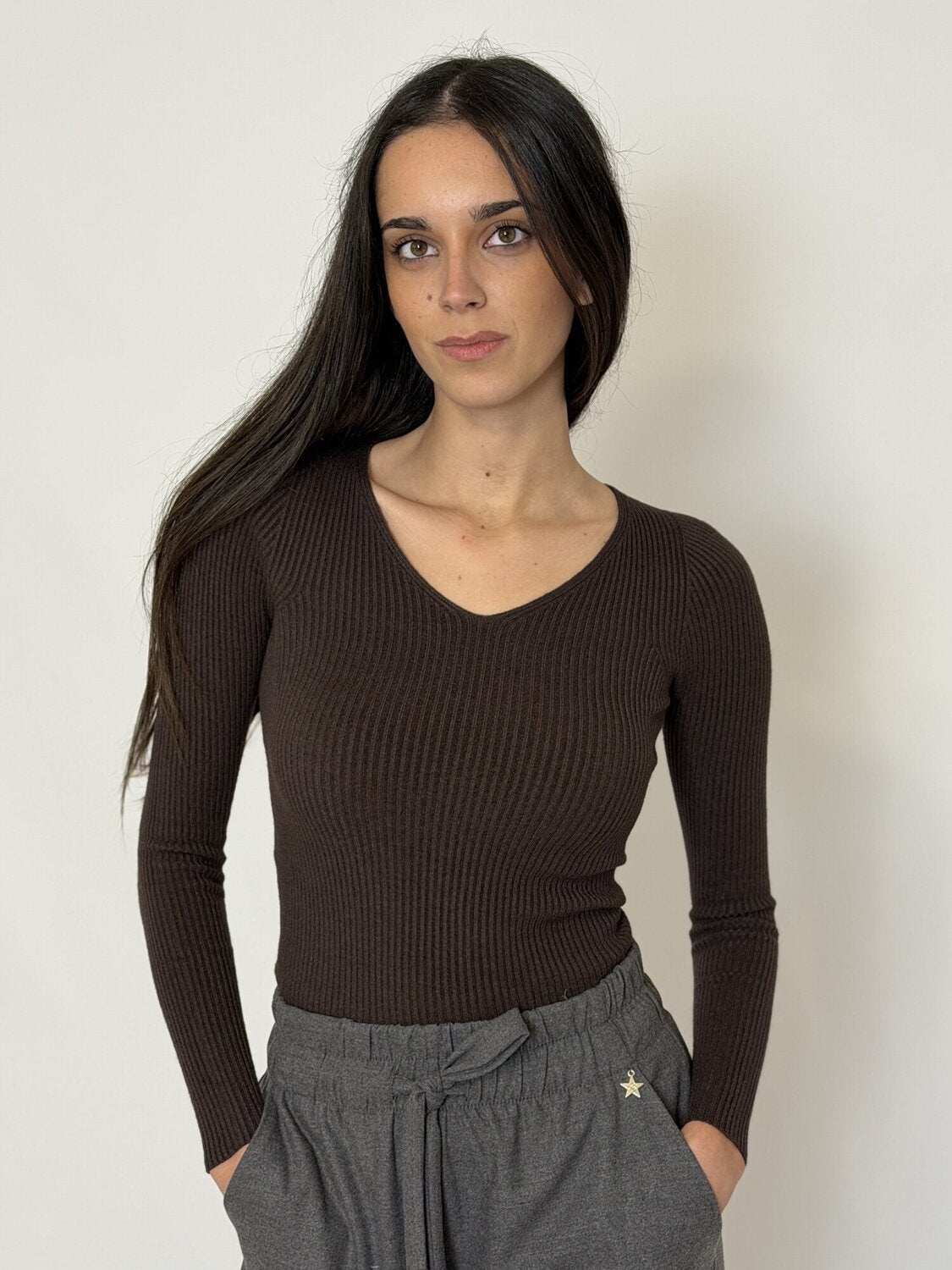 Maglia scollo v costine Moro di Souvenir. Vestibilità aderente. Disponibile in nero, moro, panna e bordeaux e grigio.