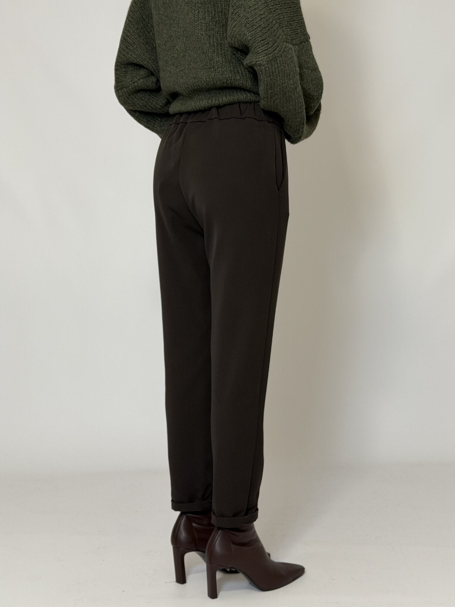 Pantalone carrot moro di Souvenir. Pantaloni con vestibilità carrot e lunghezza alla caviglia con risvolto. Chiusura con bottone e zip. Elastico in vita sul retro. Disponibili nel colore marrone, moro e nero.