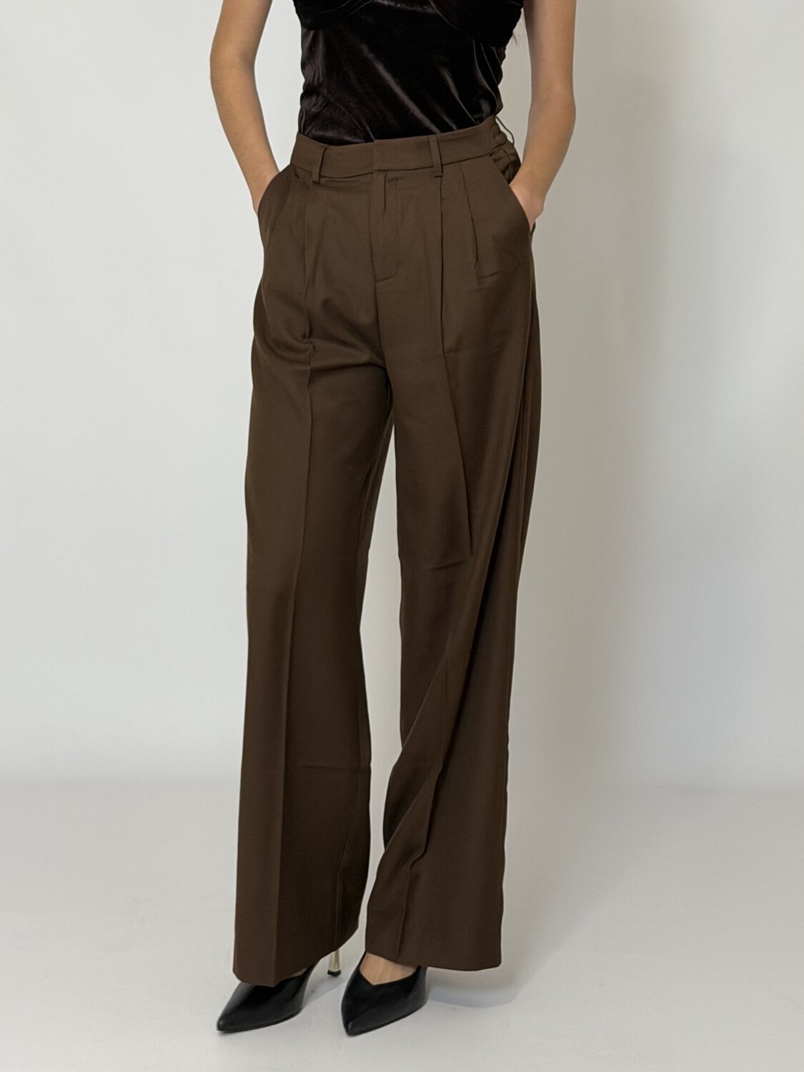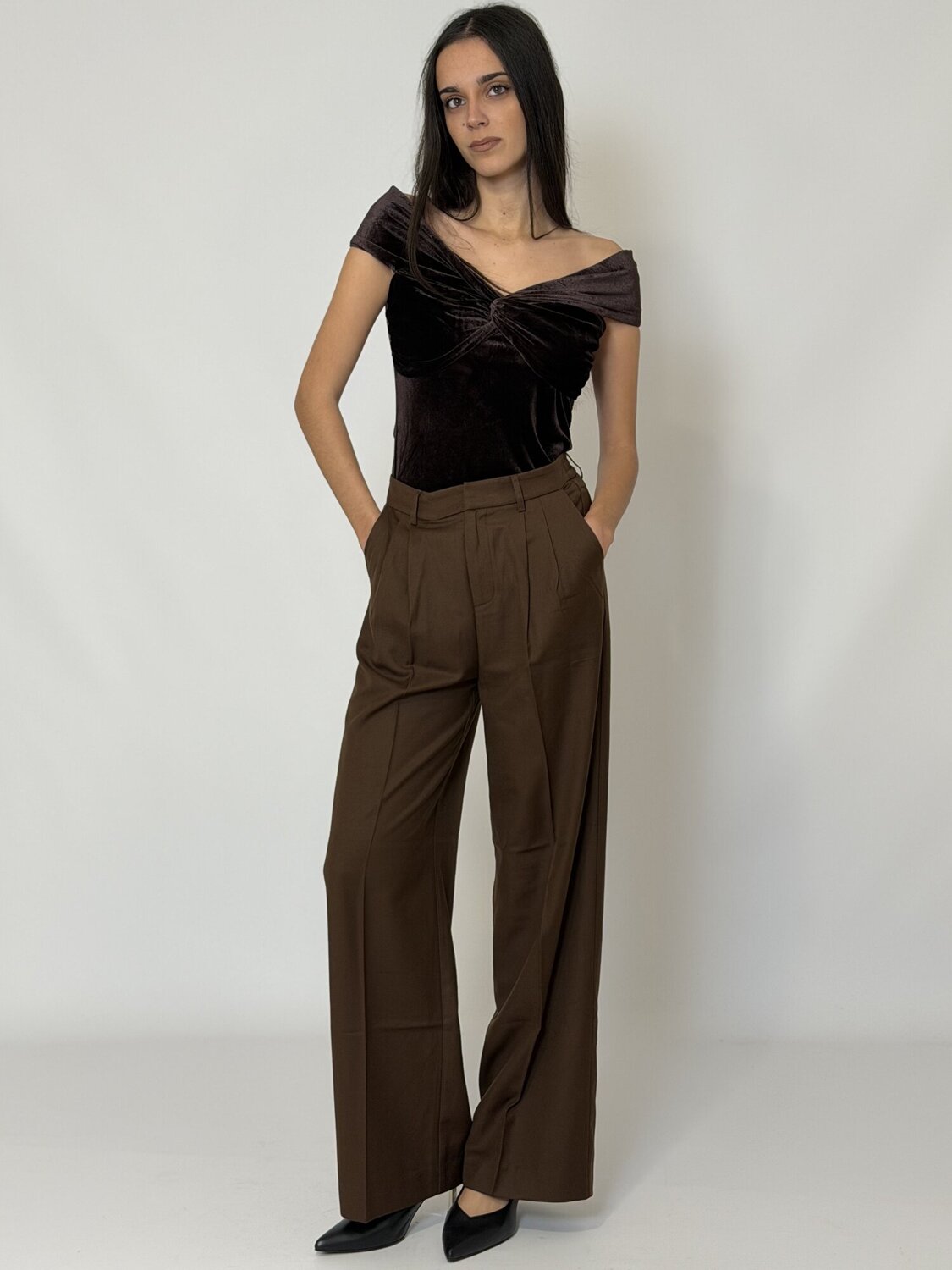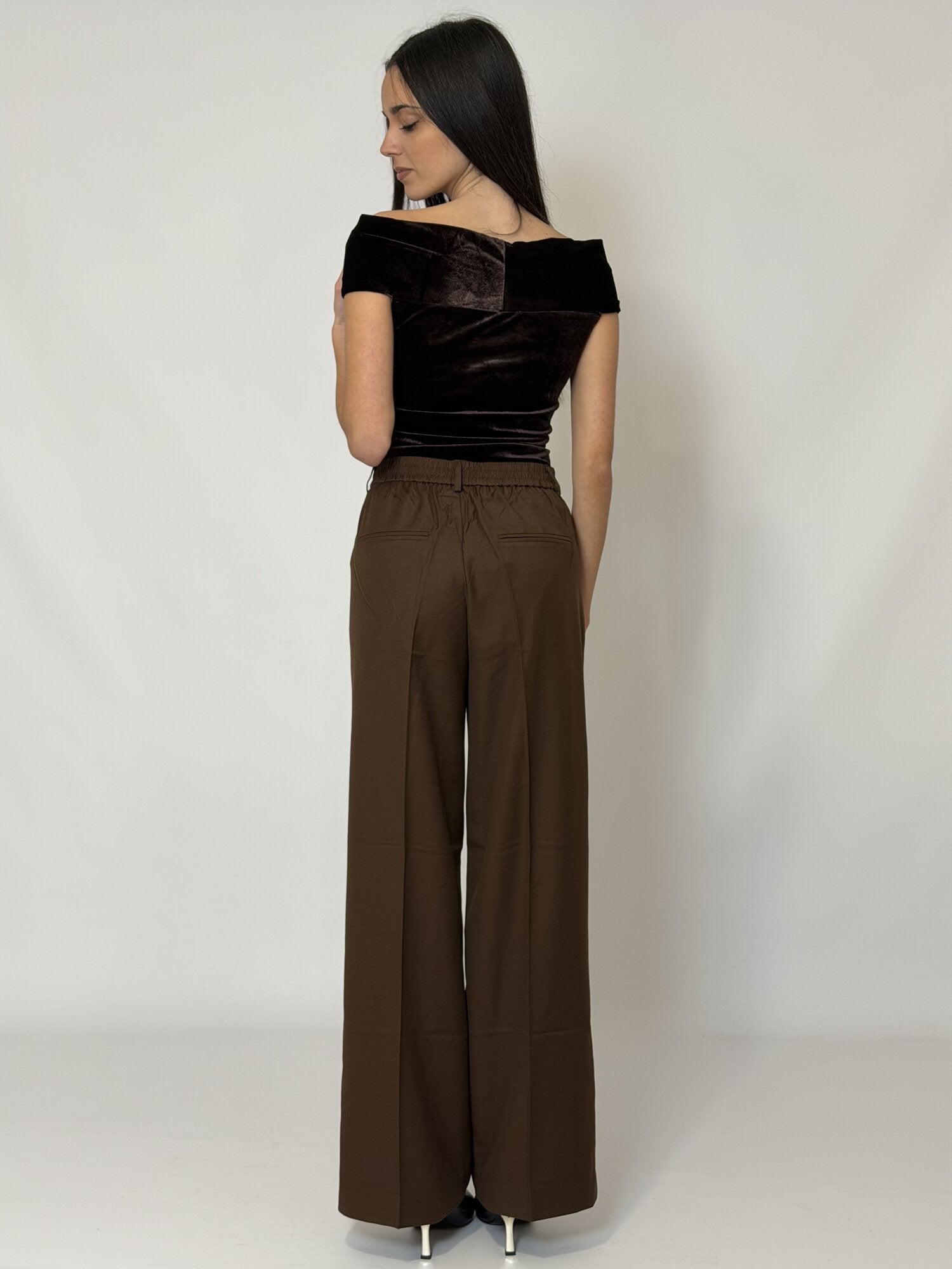 Pantalone Pences Palazzo Tatum cioccolato di Grace & Mila. Pantaloni vestibilità dritta, gamba larga. Vita alta. Vita elasticizzata sul retro. Tasche italiane sul davanti. Finta patta sul davanti. Tasche a finto filetto sul retro. Pences in vita. Pieghe a ferro lungo le gambe. Disponibile in nero e cioccolato.