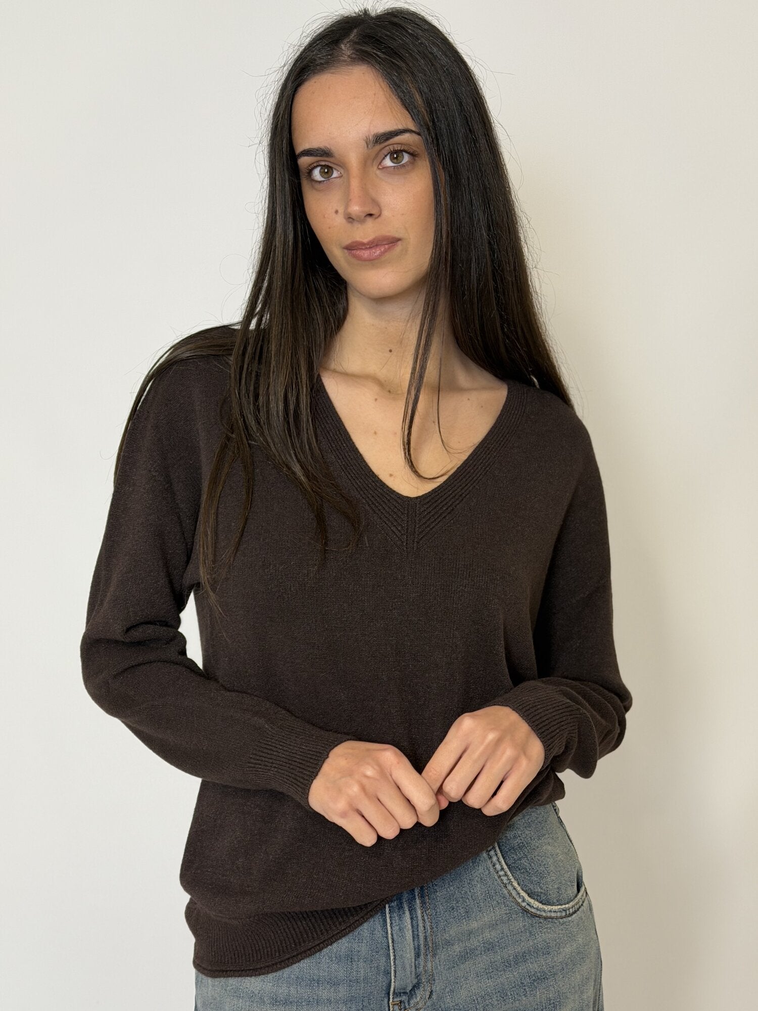 Pullover scollo a V moro di Vicolo. Pullover in maglia con scollo a V profondo e maniche lunghe. Bordo a costine su polsini e fondo. Vestibilità morbida e classica. Disponibile nel colore nero, moro e cammello.