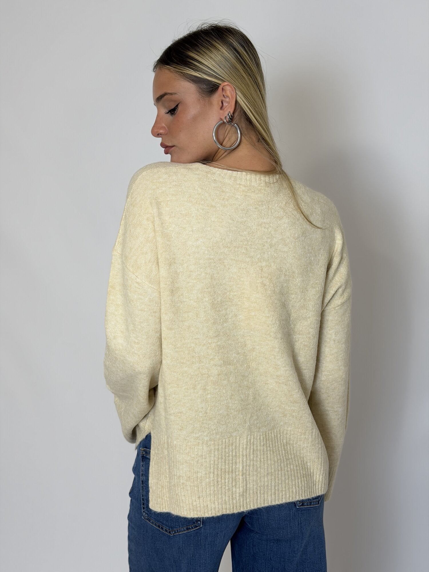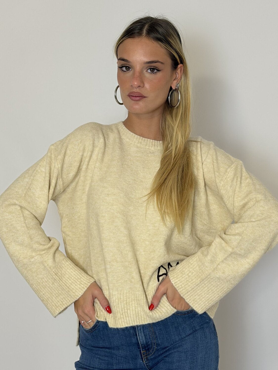 Pullover con scritta AMORE Saints burro di Grace & Mila. Maglione ampio a maniche lunghe. Scollo rotondo. Messaggio ricamato sul davanti centrale "AMORE". Dettaglio degli spacchi sui lati. Maniche ampie. Taglio boxy. Disponibile in antracite, burro e panna.