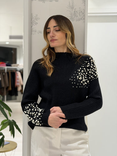Maglia Cratere Applicazioni Nero di Haveone. Pullover a costine con mezzocollo a maniche lunghe, e applicazioni su collo e maniche. Taglia unica. Disponibile in nero, panna e bordeaux.