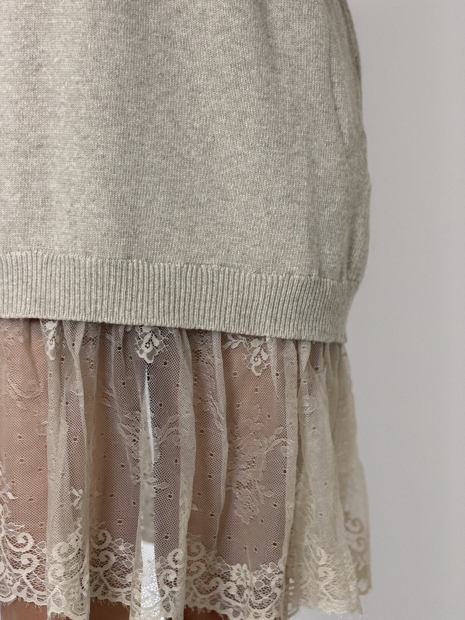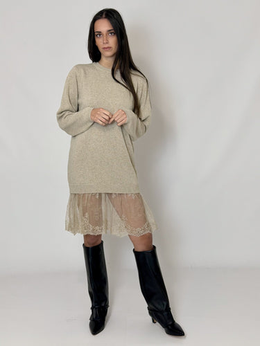 Abito in maglia con pizzo beige di Vicolo. Abito corto in maglia con gonna in pizzo trasparente. Abito a maniche lunghe con parte superiore in maglia, collo tondo e vestibilità morbida. La parte inferiore è composta da un inserto in tulle/pizzo trasparente color grigio chiaro, che crea un effetto a strati sulla gonna. Lunghezza sopra il ginocchio. Disponibile nel colore grigio chiaro e beige.