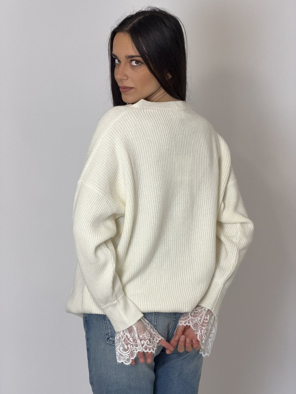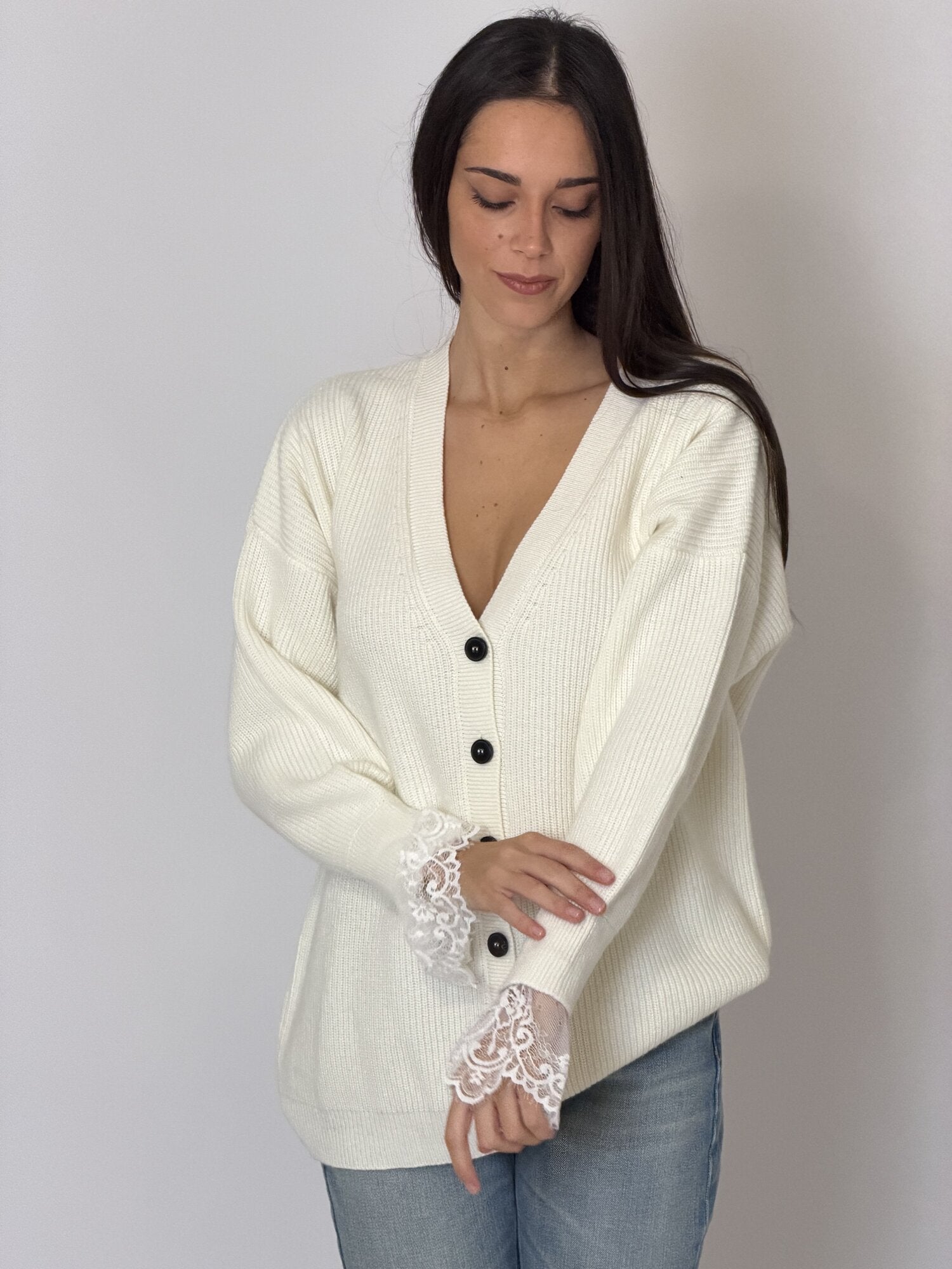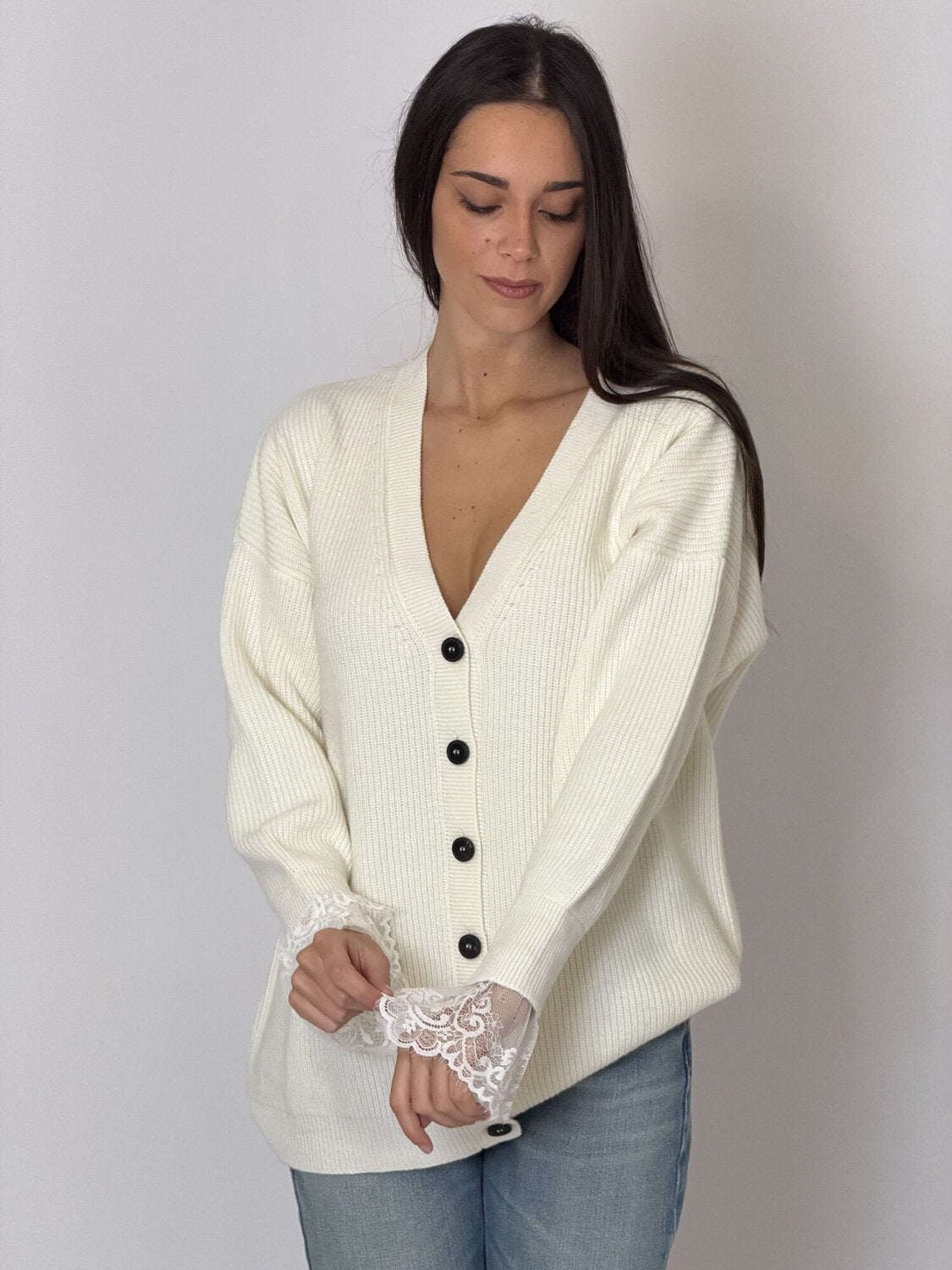 Cardigan lungo inserti in pizzo panna di Vicolo. Cardigan in maglia a costine con scollo a V e bottoni frontali. Polsini svasati in pizzo tono su tono a contrasto. Vestibilità morbida e lunghezza sui fianchi. Disponibile nel colore moro, nero, bordeaux, panna.