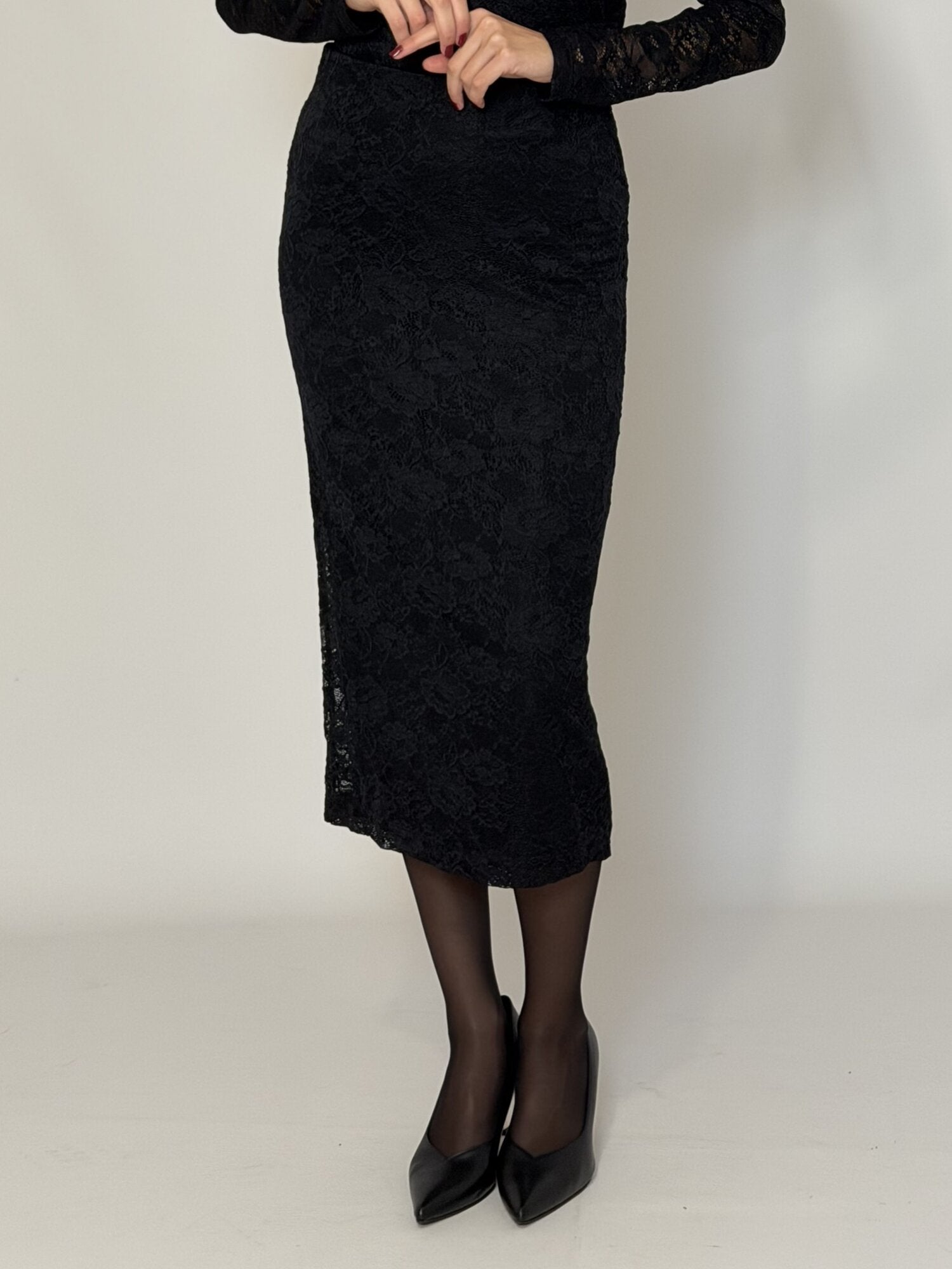 Gonna pencil midi in pizzo stretch disegno fiore, elastico in vita, foderata. Lunghezza: cm 80. Disponibile in nero.