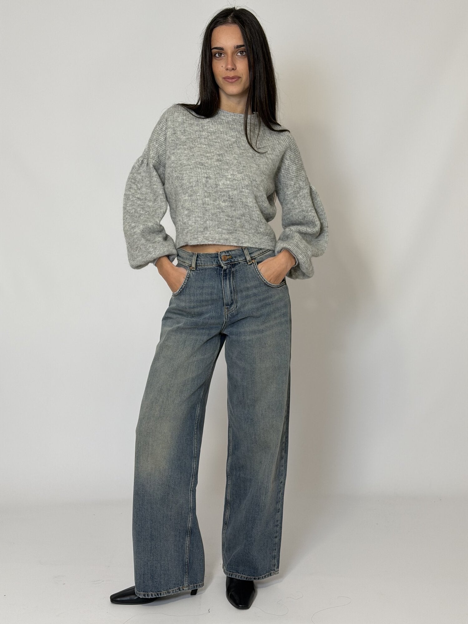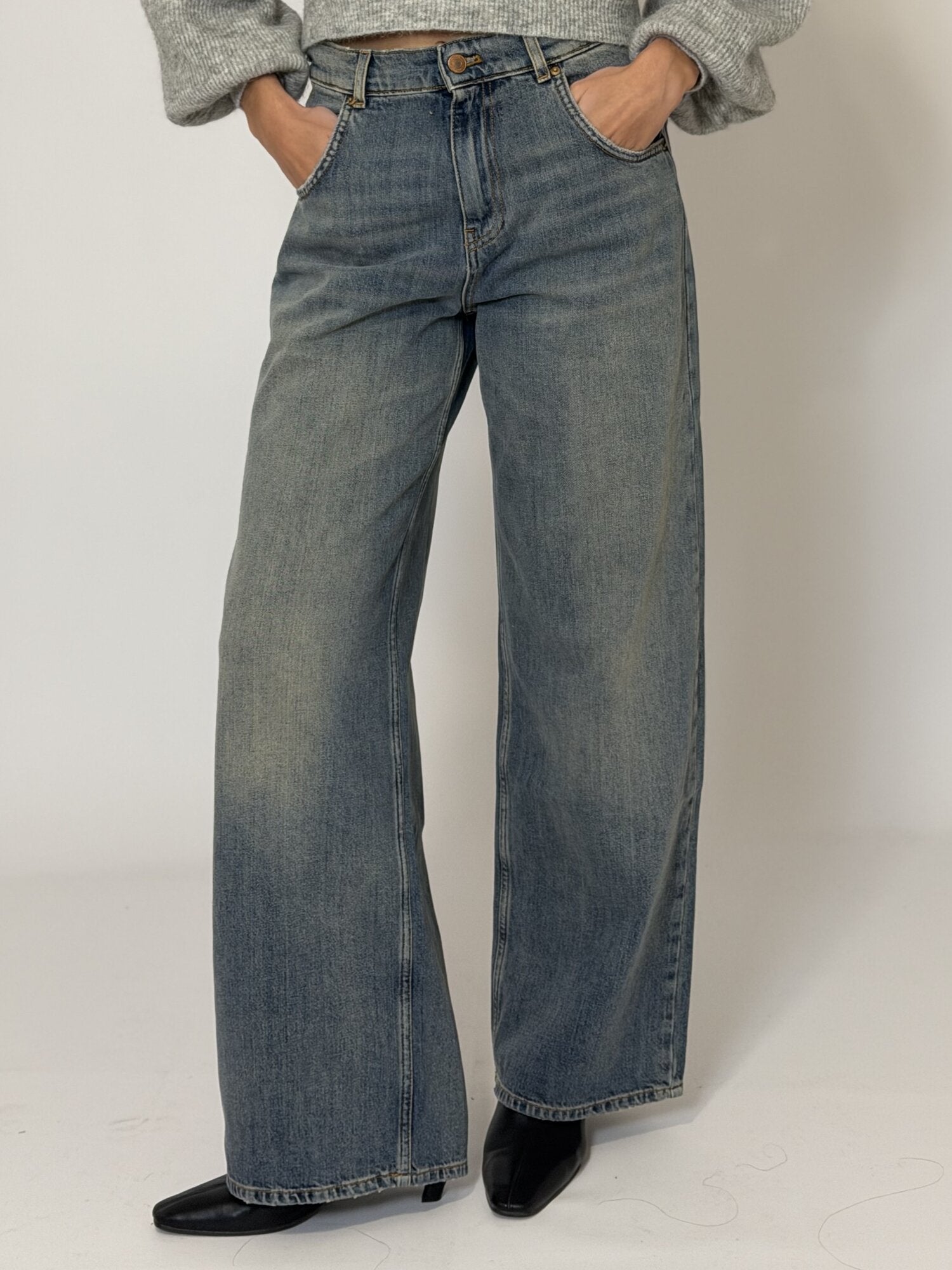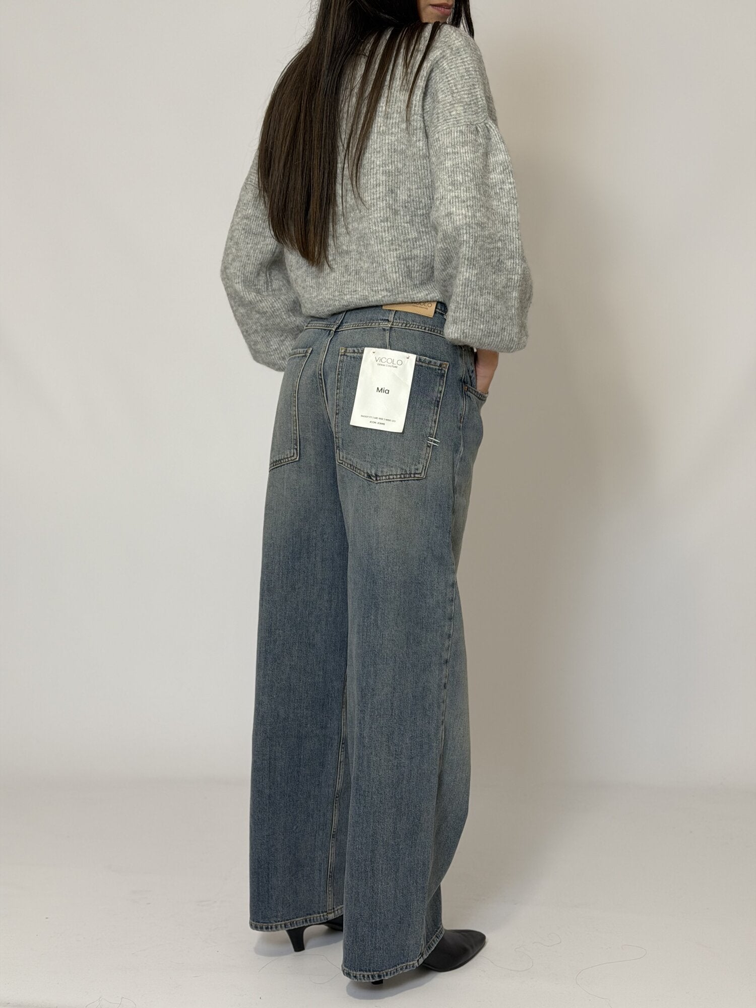 Jeans wide leg Mia denim slavato di Vicolo. Jeans a vita alta con vestibilità morbida e taglio dritto. Dettaglio di ampie tasche frontali e chiusura con bottone e zip. Fondo ampio e lungo. Disponibili nel colore denim scuro, bordeaux, moro e denim blu slavato.