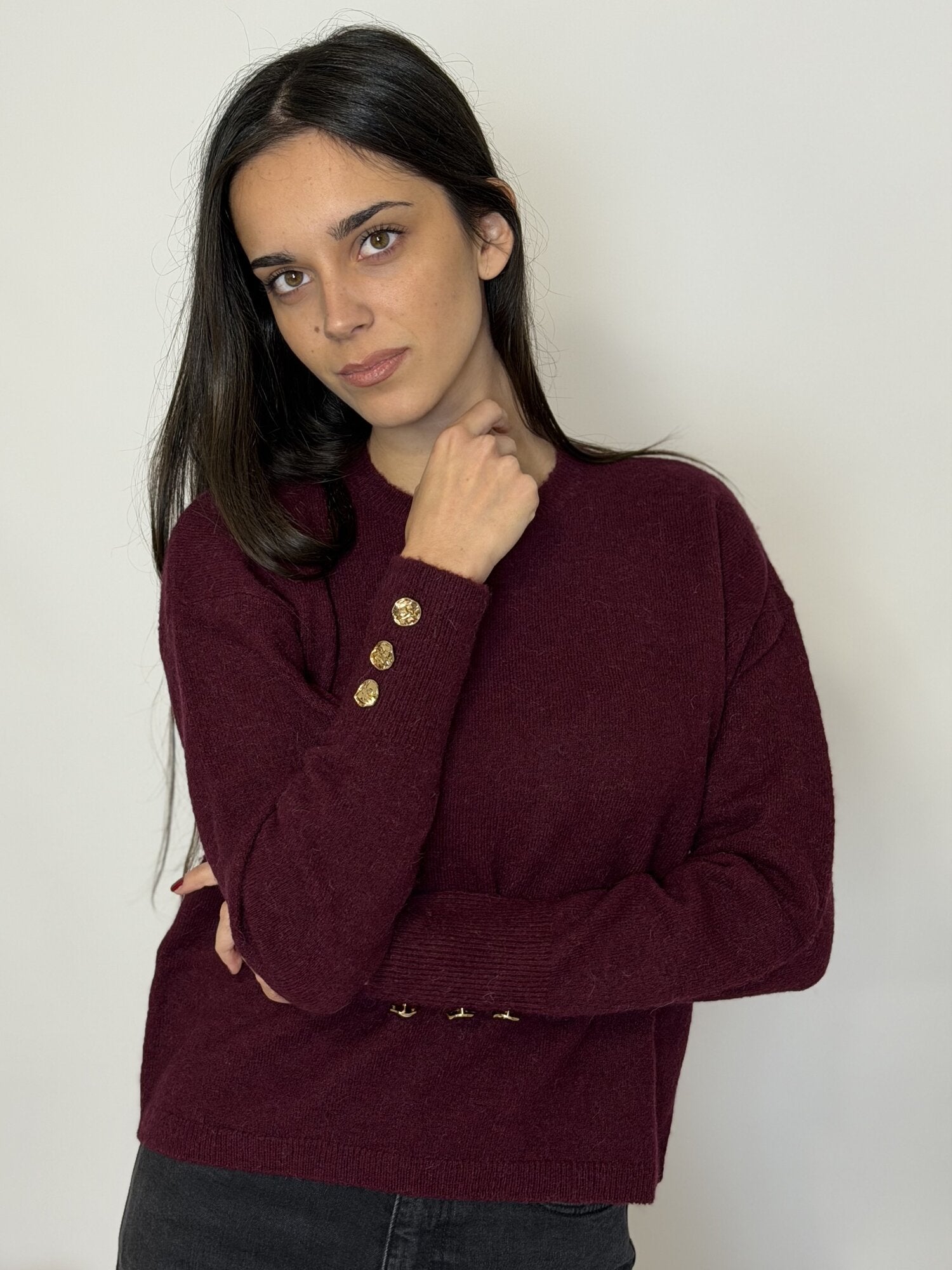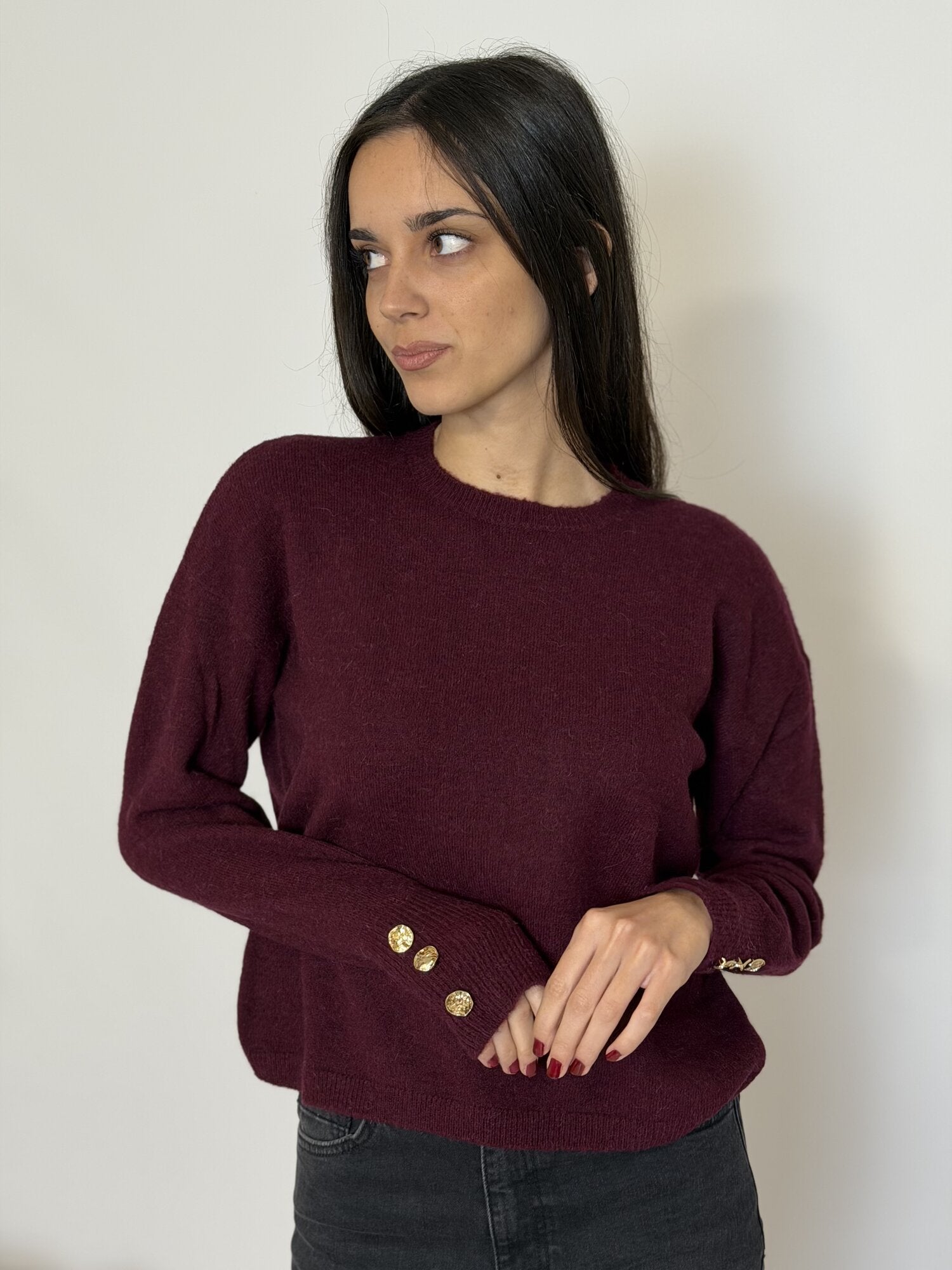 Maglia in filato misto alpaca, manica lunga e scollo tondo, polso alto con dettaglio di bottoni design colore oro. Lunghezza: cm 55. Disponibile nel colore bordeaux.