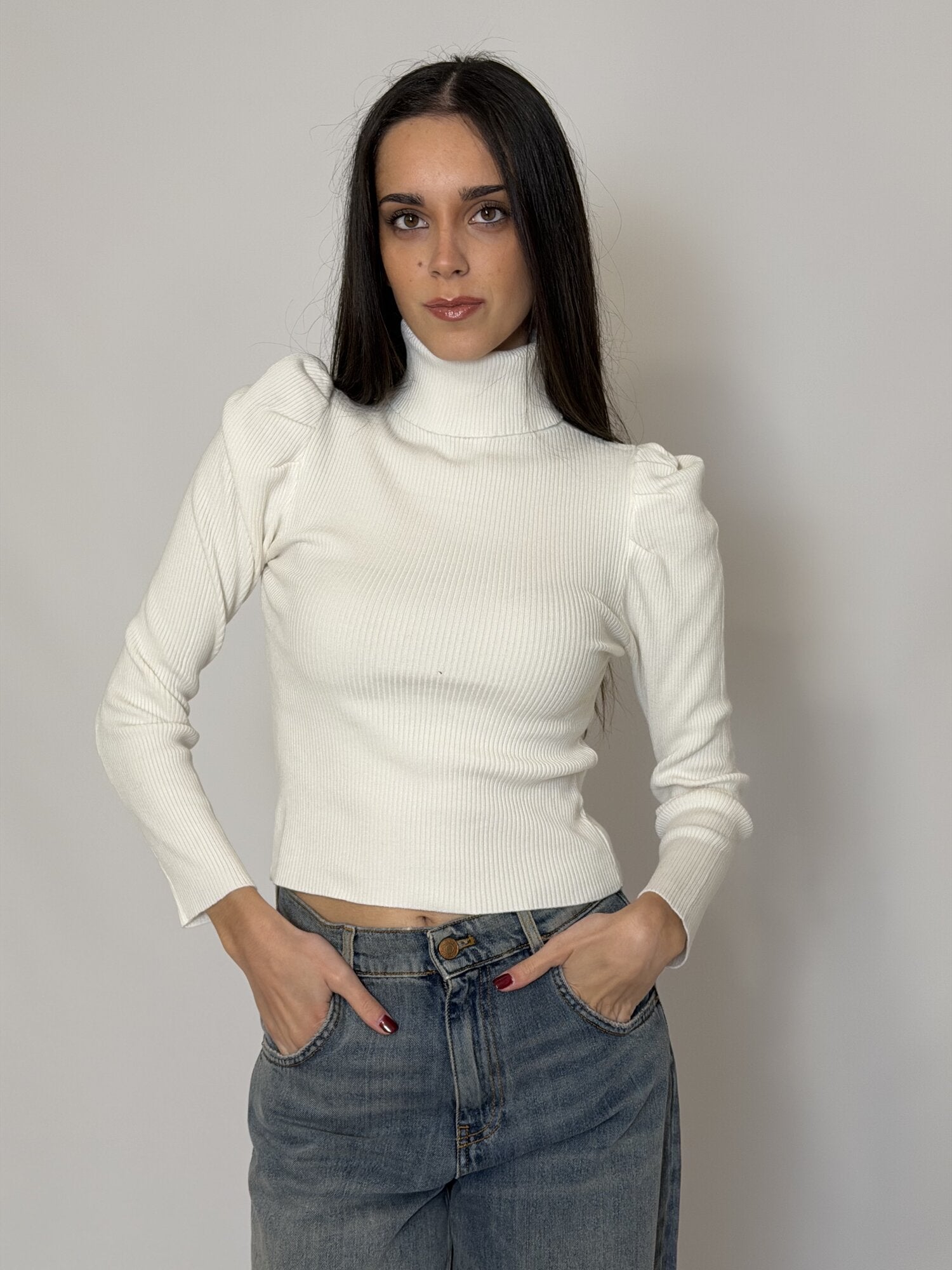 Pullover a collo alto in maglia a costine color bianco panna/ecrù, con maniche a sbuffo di Souvenir. Maglia a collo alto e maniche lunghe. Vestibilità aderente (slim fit) con lunghezza cropped. Realizzata in maglia a costine. Spalle a sbuffo (puff sleeves). Disponibile in panna, blu notte, moro e nero.
