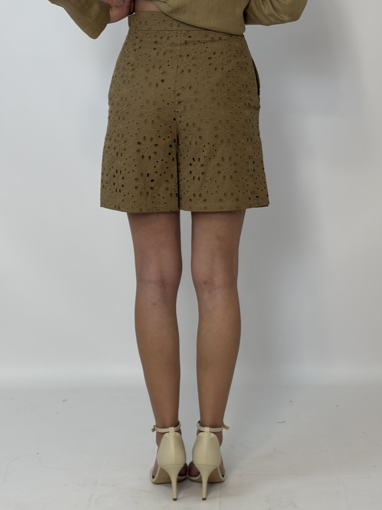 Bermuda in mussola di cotone con ricamo sangallo. Fit regolare. Chiusura con bottone a vista. Tasche laterali inserite. Capo foderato in tessuto on tone.