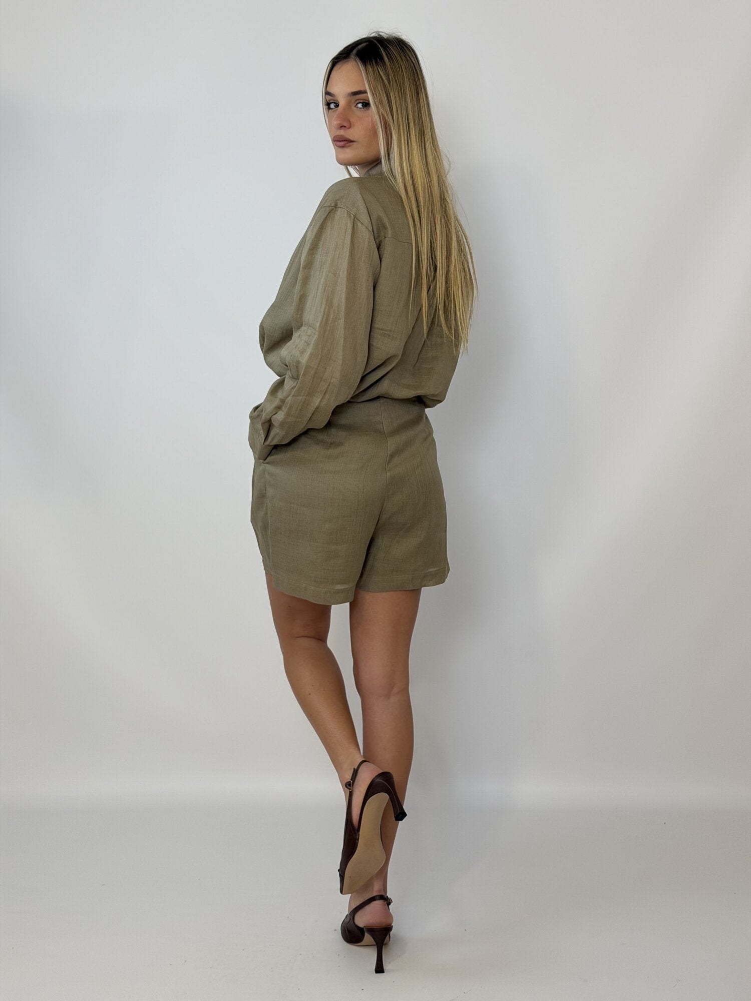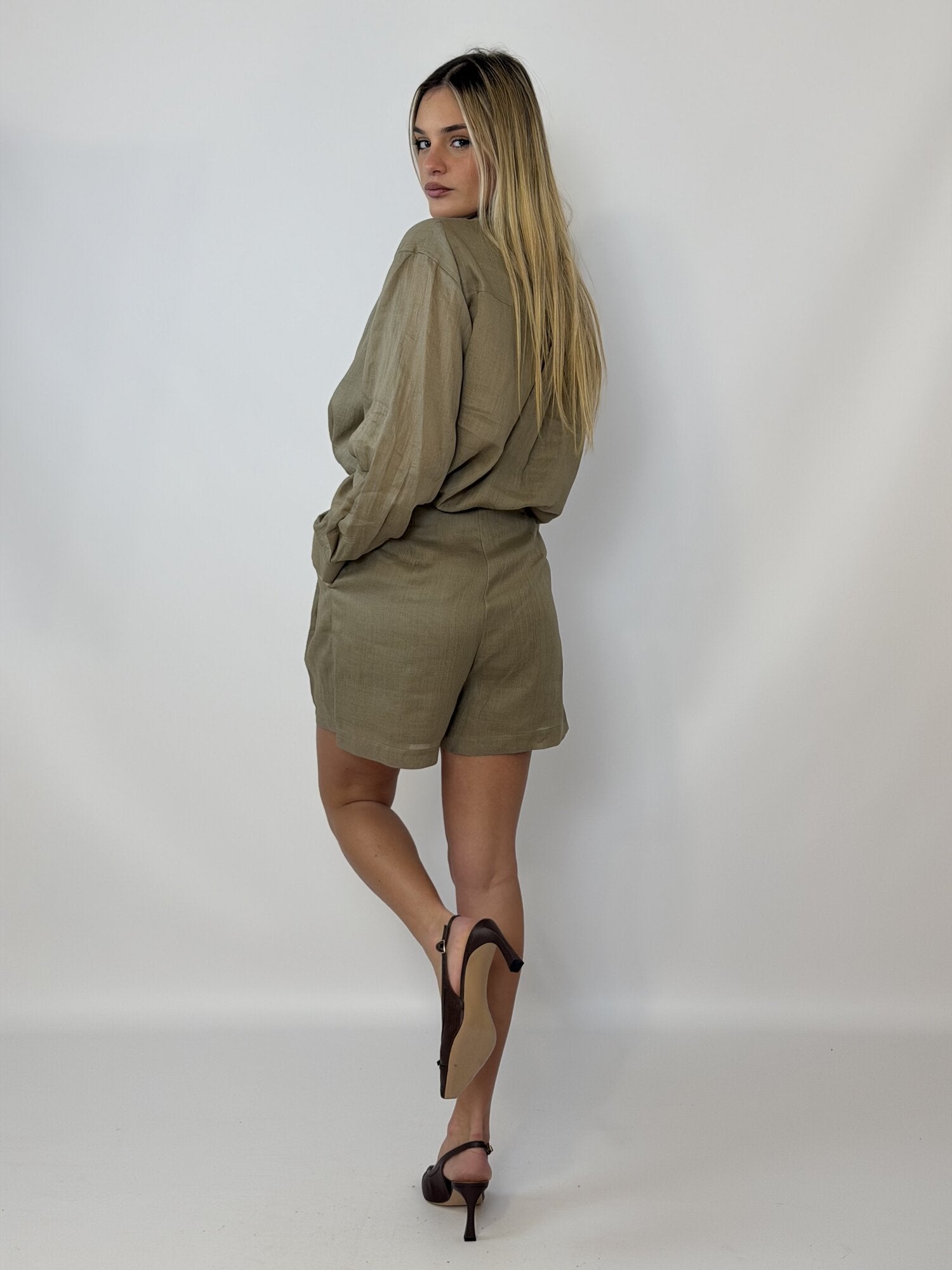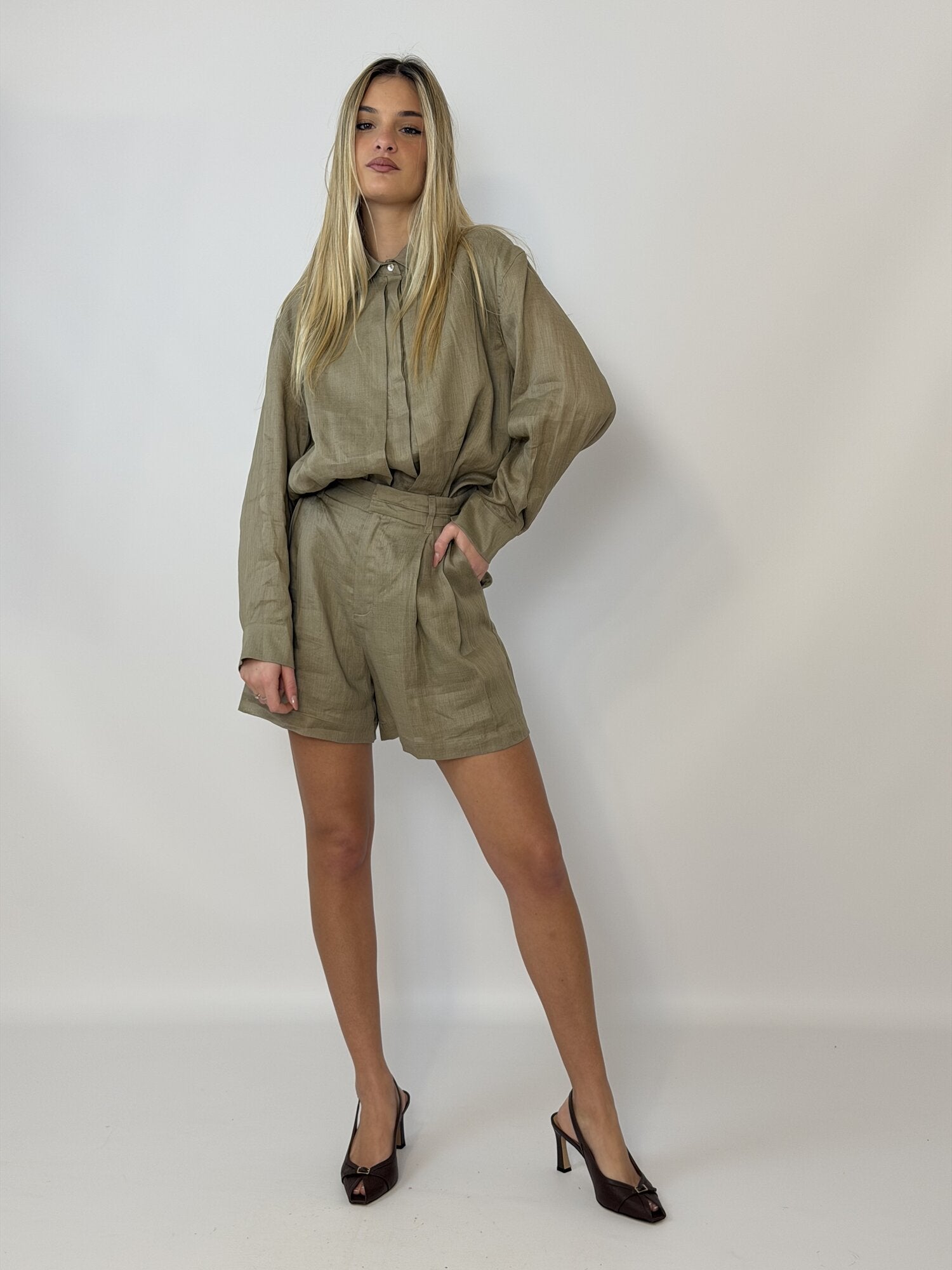 Questo pantalone ha una linea morbida e strutturata allo stesso tempo, perfetta per un look estivo curato. La vita è alta e definita, con pence frontali che danno forma senza rinunciare alla comodità. Il tessuto, leggero e dallaspetto naturale, crea un effetto rilassato ma sempre elegante.