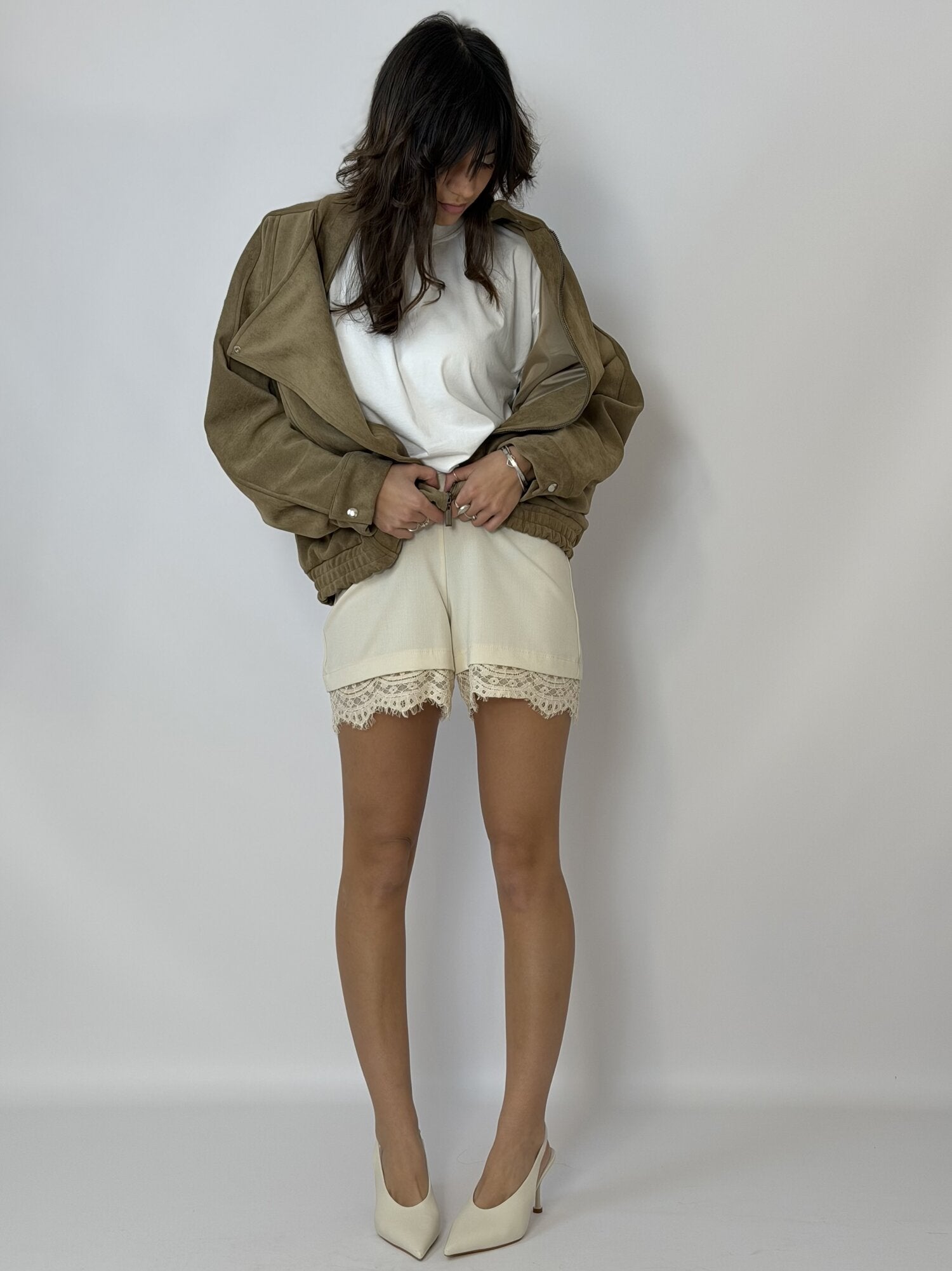 Questo shorts in pizzo panna ha unestetica delicata e femminile. La linea è morbida e leggermente svasata, mentre il bordo in pizzo che spunta dallorlo aggiunge un dettaglio raffinato e luminoso. Un capo fresco e versatile, perfetto per look estivi curati e dallallure romantica.
