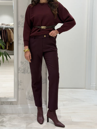 Pantalone Dritto Bordeaux di Souvenir. Pantalone lungo modello dritto a vita alta con tasche laterali. Chiusura con cerniera e bottone dorato a contrasto. Disponibile in moro e bordeaux.