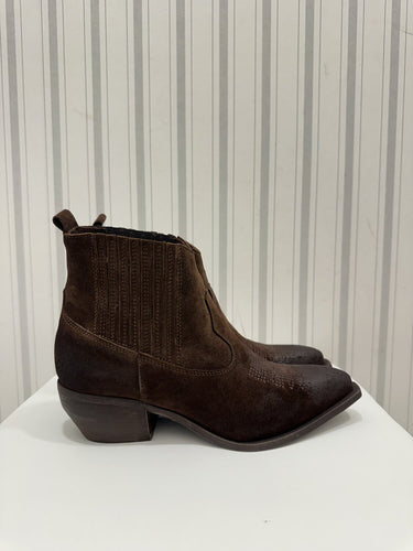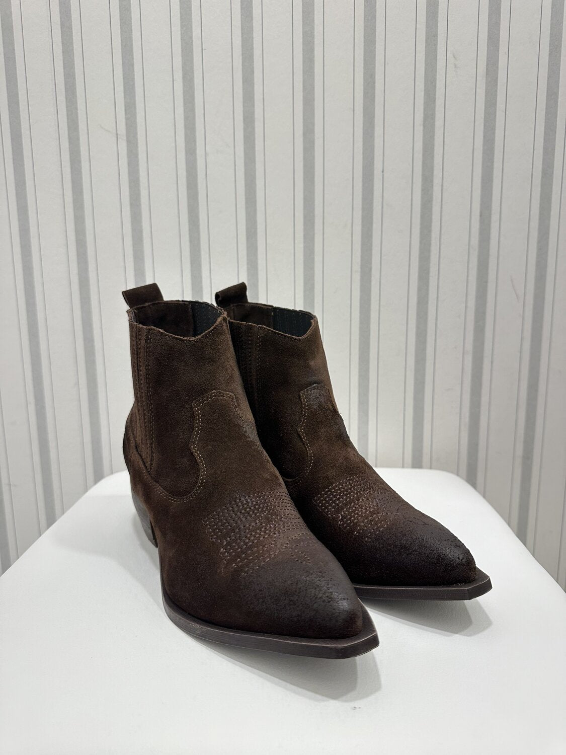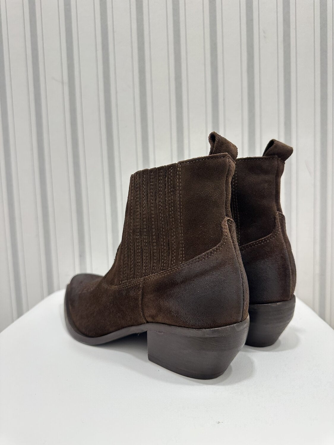 Camperos Basso Crosta Moro di Ovyé. Camperos basso dal carattere deciso e intramontabile, realizzato in crosta di pelle color moro. Il design richiama lo stile western con linea affusolata e punta leggermente sagomata, mentre linserto elastico laterale garantisce praticità e comfort nella calzata. Il tacco basso e stabile lo rende ideale per un utilizzo quotidiano, perfetto da abbinare a jeans, abiti o gonne per un look grintoso ma versatile.