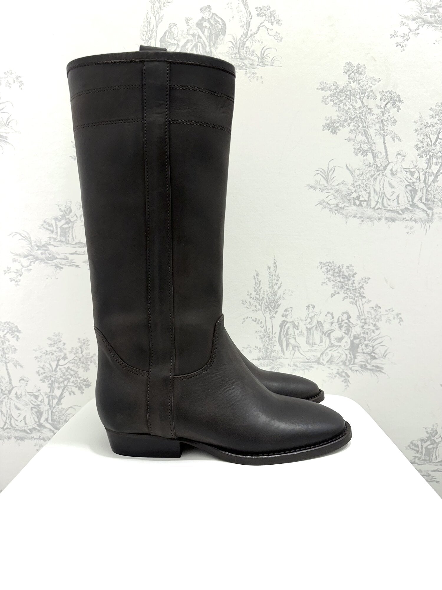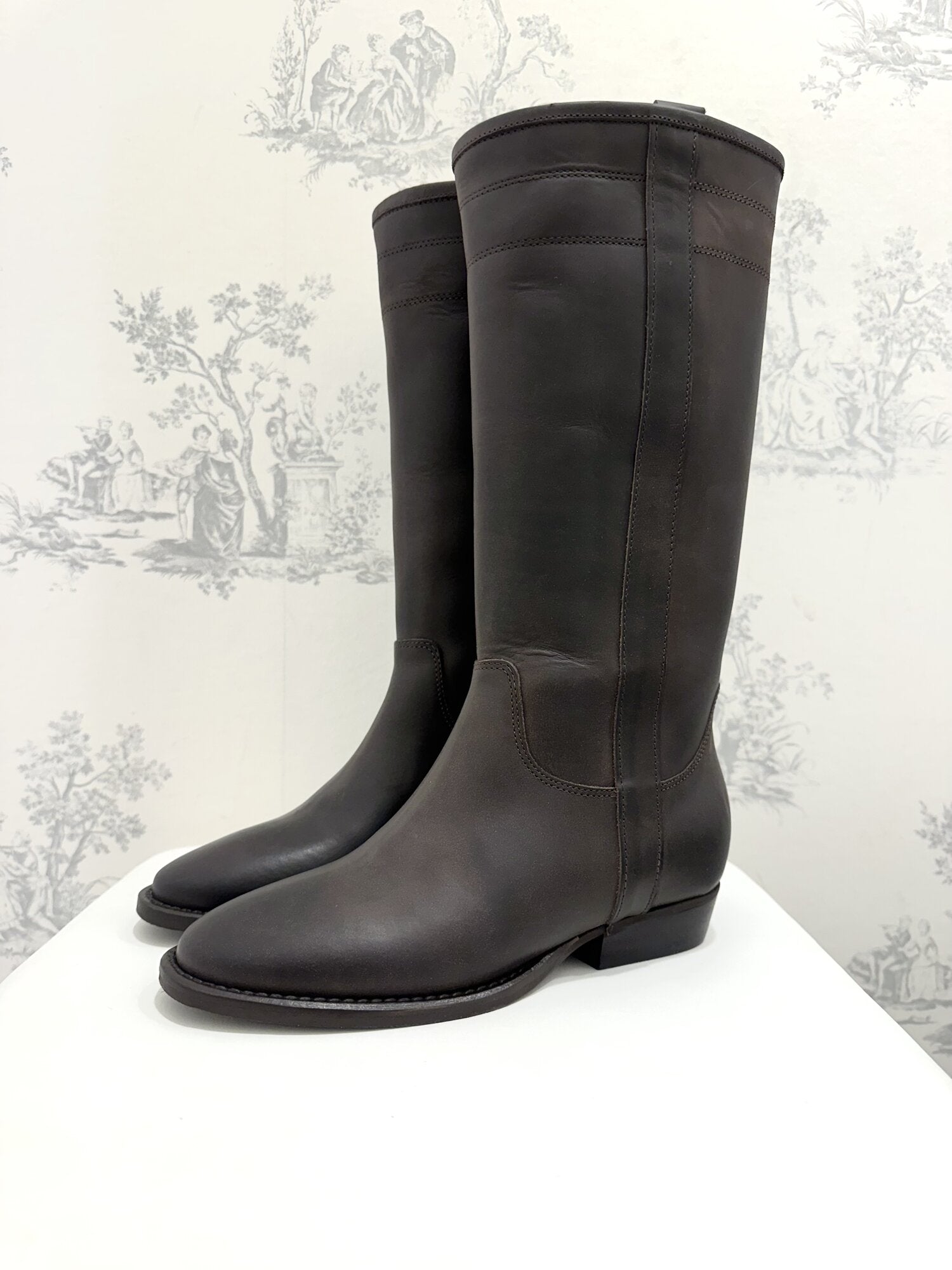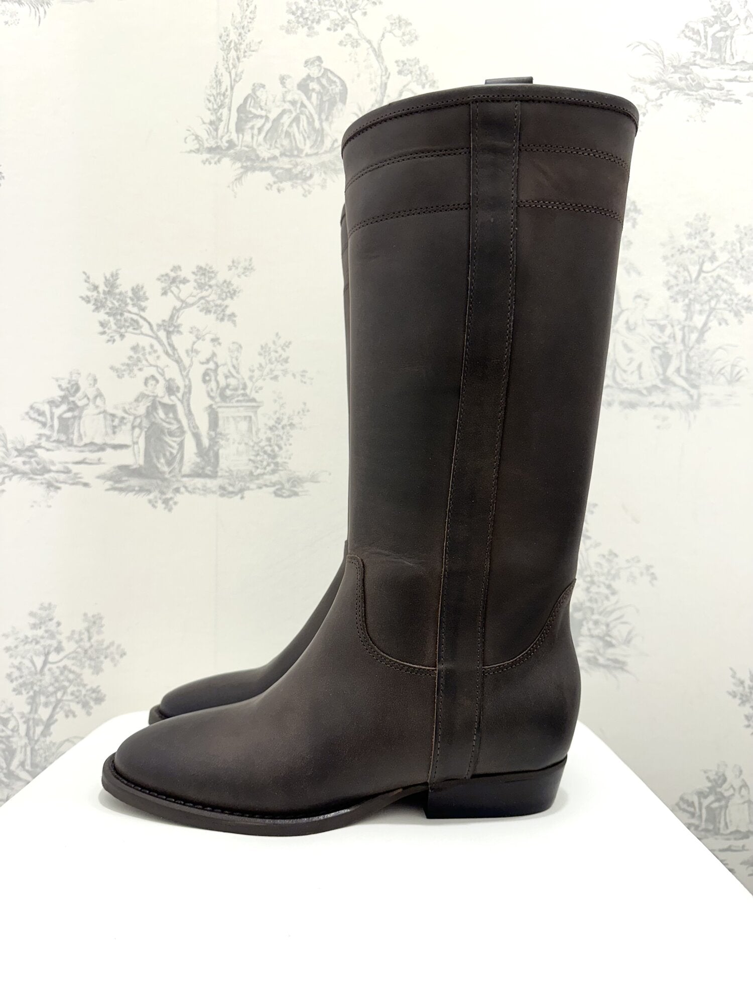 Stivale camperos pelle invecchiata moro di Ovyé. Stivali alti in pelle con scollo frontale e punta affusolata. Tacco basso a blocco e gambale dritto. Dettaglio di cuciture a contrasto. Disponibili nel colore caffè e moro.