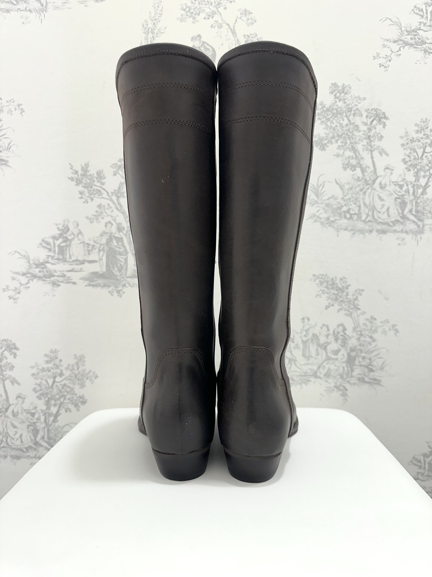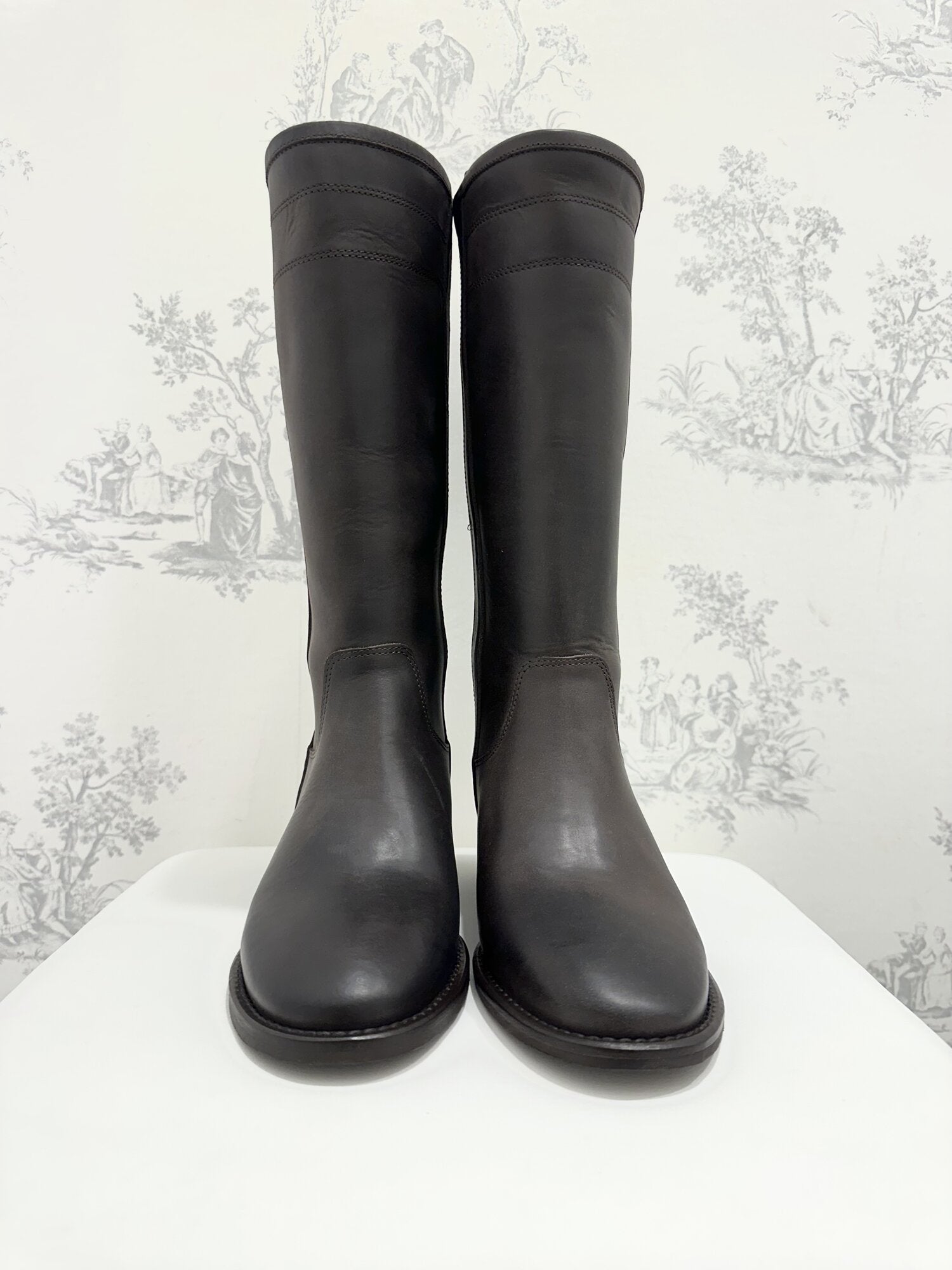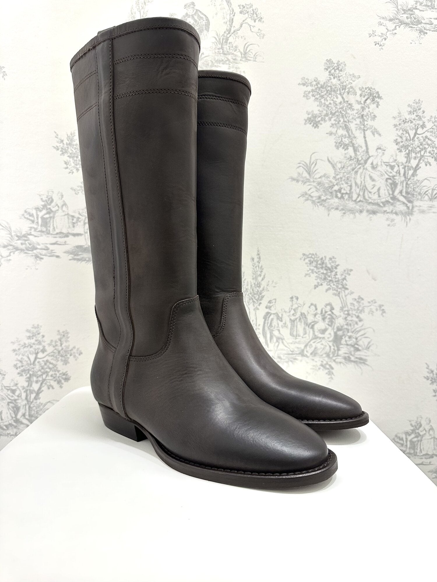 Stivale camperos pelle invecchiata moro di Ovyé. Stivali alti in pelle con scollo frontale e punta affusolata. Tacco basso a blocco e gambale dritto. Dettaglio di cuciture a contrasto. Disponibili nel colore caffè e moro.