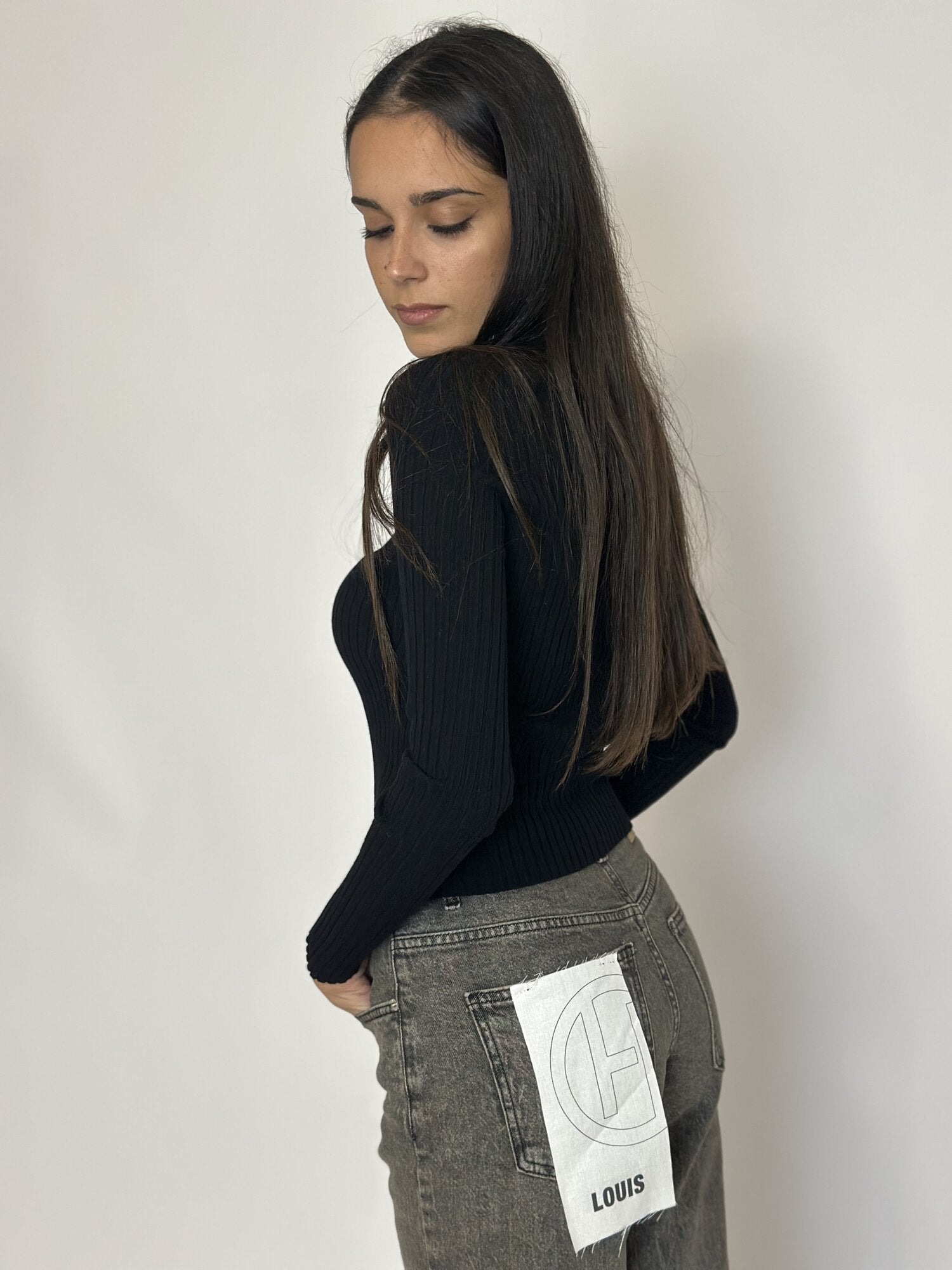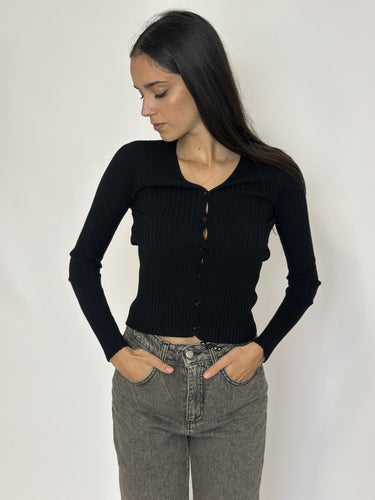 Cardigan a costine con scollo a V nero di Vicolo. Cardigan a lunghezza corta con scollo a V e abbottonatura frontale con bottoni tono su tono. Maniche lunghe. Vestibilità aderente. Tessuto a costine morbido ed elasticizzato. Disponibile nel colore oliva, nero, moro, panna e bordeaux.