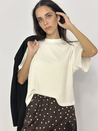 Tshirt boxy a manica corta burro di Haveone.T-shirt a maniche corte con scollo rotondo. Vestibilità morbida a scatolina. Disponibile nel colore burro, nero e vinaccio.