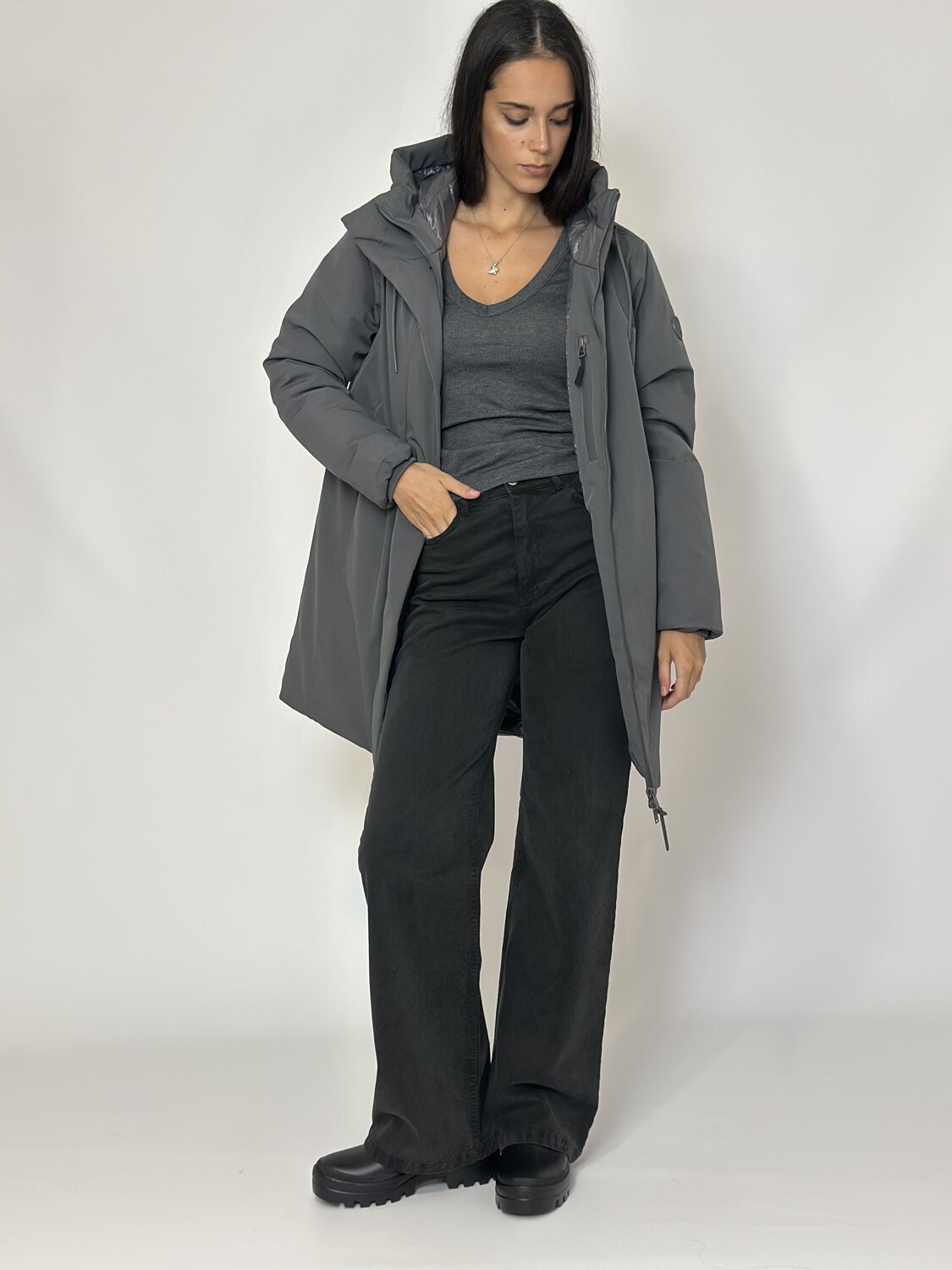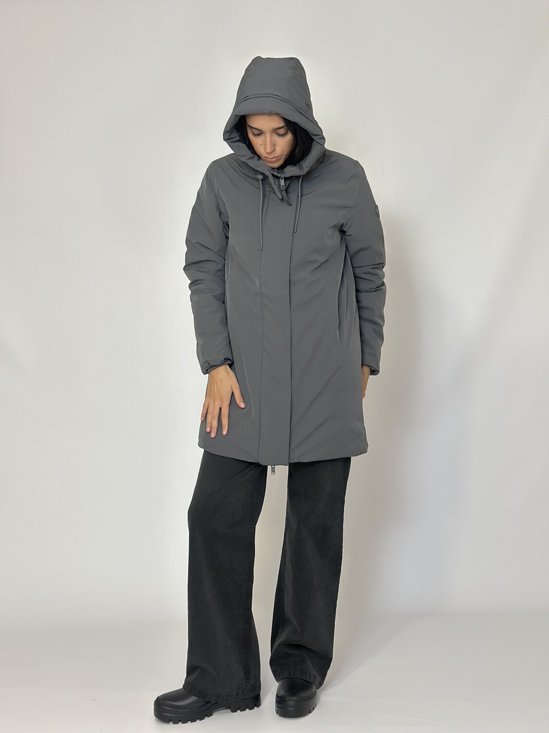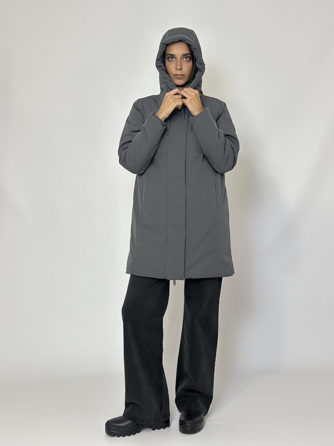 Piumino parka Sturm grigio di Tanta Rainwear. Cuciture completamente sigillate; capo cucito interamente con filati impermeabili. Cerniera frontale a doppio cursore in nylon con patta nascosta con chiusura magnetica. Tasche cucite con cerniere impermeabili nascoste; fodera delle tasche in pile; tasca interna con cerniera sul petto; tasca interna extra per guanti o berretto. Polsini antivento; ampio cappuccio con cordino regolabile e collo alto. Taglio regolare con silhouette a forma di A. Disponibile in grigio e avorio.