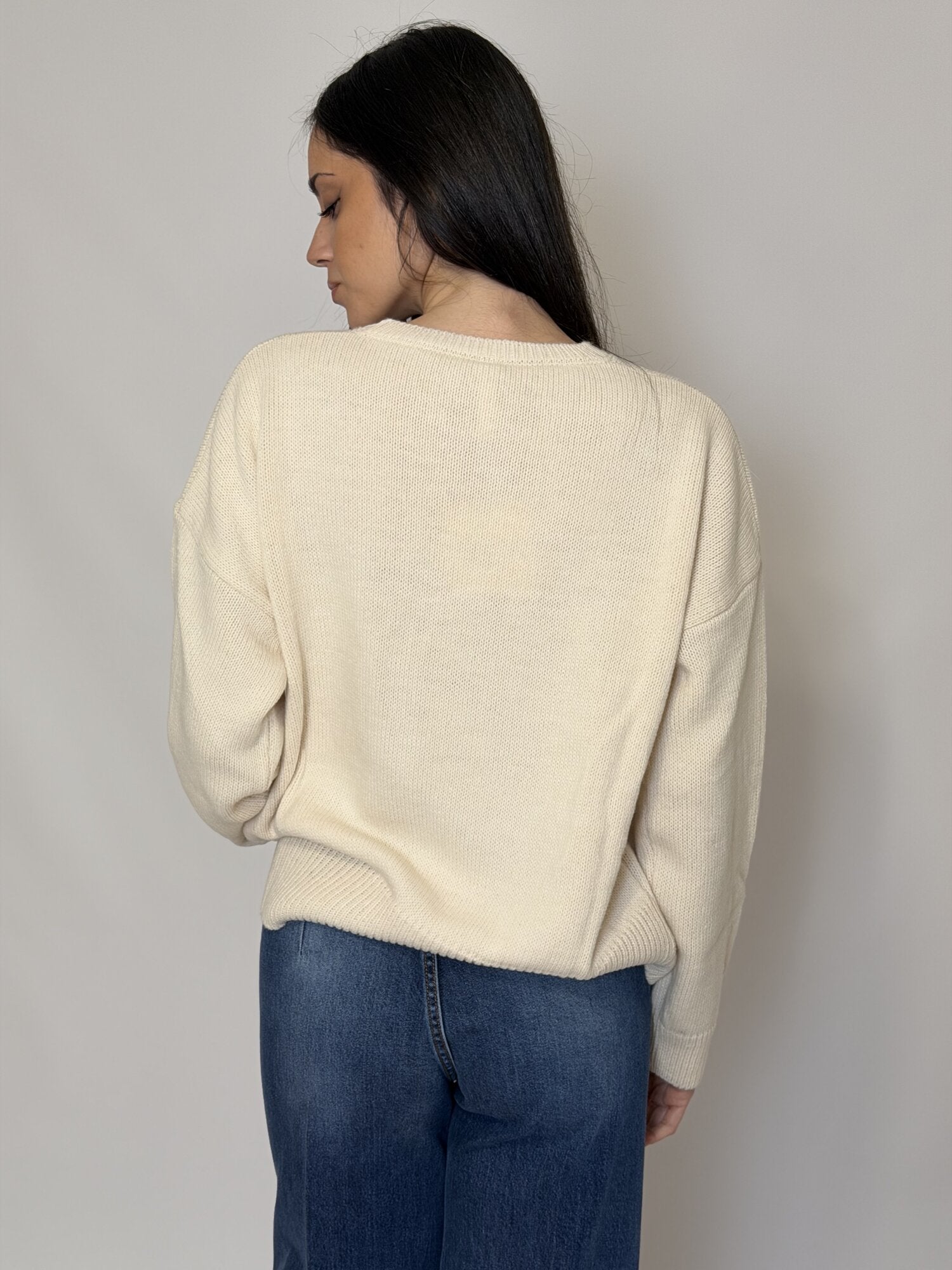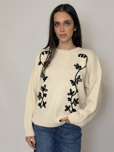 Maglia Fiori Ricamati Panna di Tensione In. Pullover girocollo con maniche lunghe e ricami floreali a contrasto. Taglia unica. Disponibile in grigio e panna.