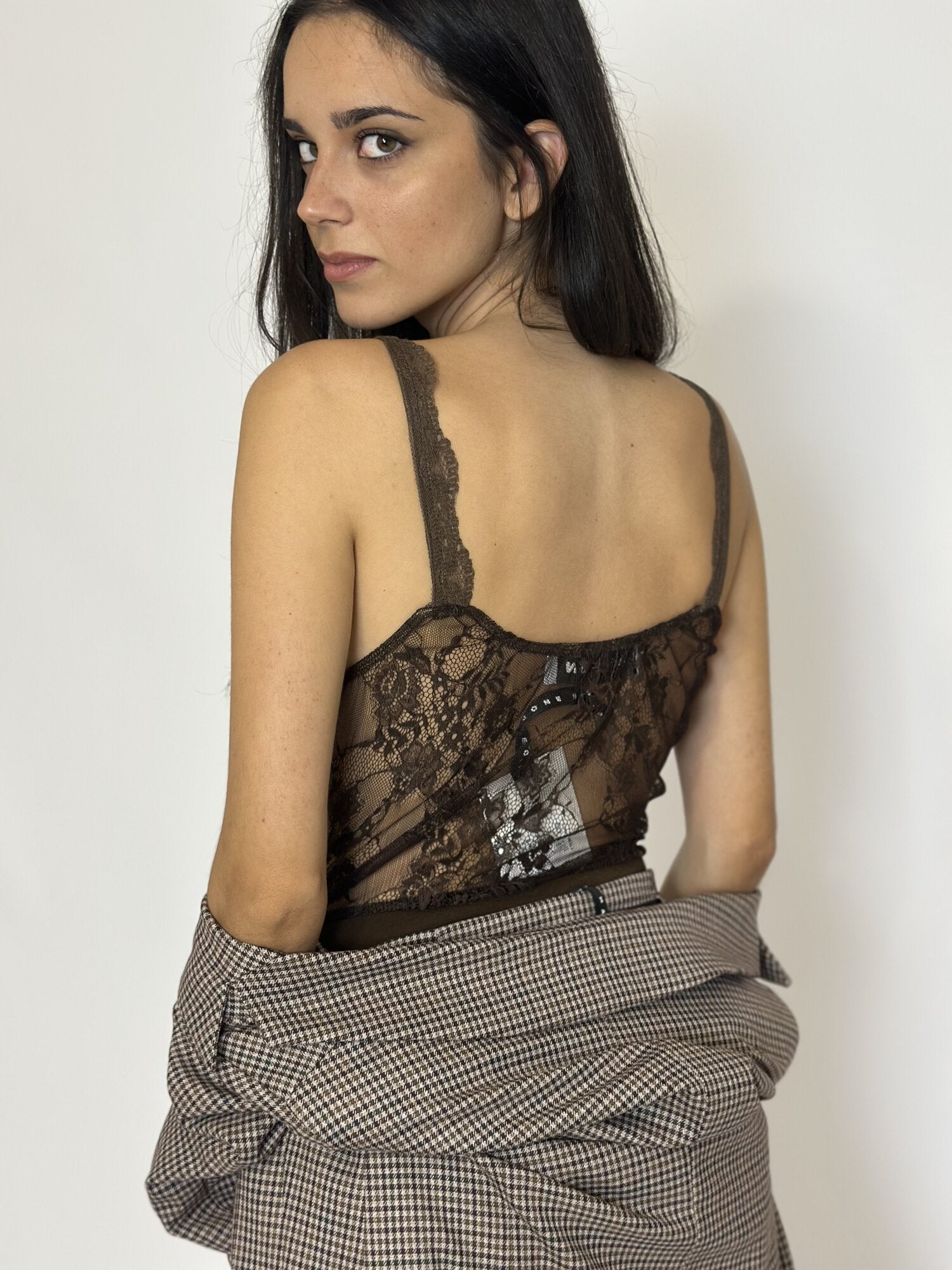 Body in satin e pizzo cioccolato di Haveone. Body in pizzo con scollo a V e spalline sottili. Dettaglio di coppe arricciate sul seno e vestibilità aderente. Chiusura con bottoni a pressione sul fondo. Disponibile nel colore cioccolato e nero.