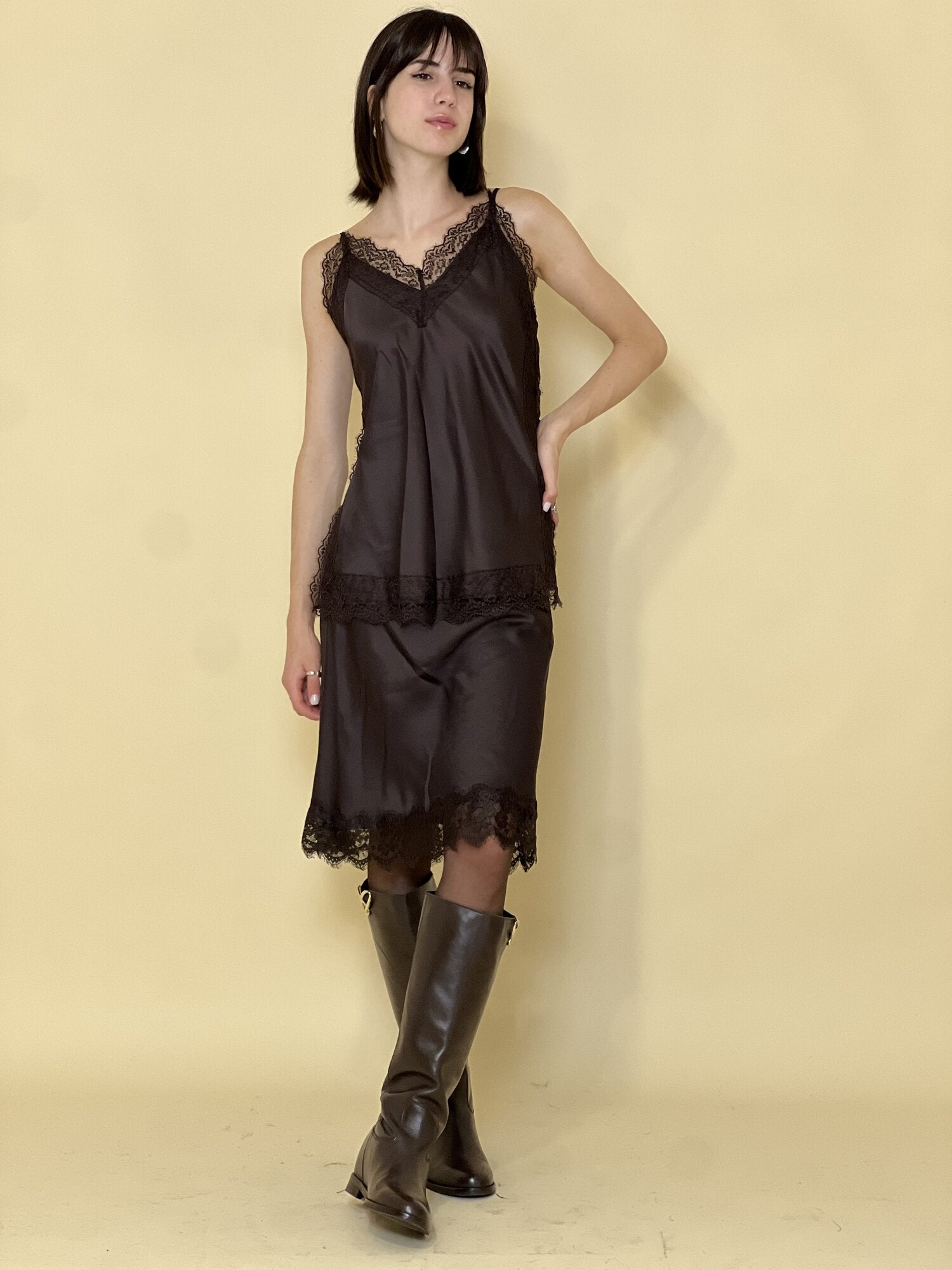 Canotta raso pizzo moro di Vicolo. Top a sottoveste con scollo a V e spalline sottili. Dettagli in pizzo tono su tono. Vestibilità morbida. Disponibile in moro, vinaccio e nero.