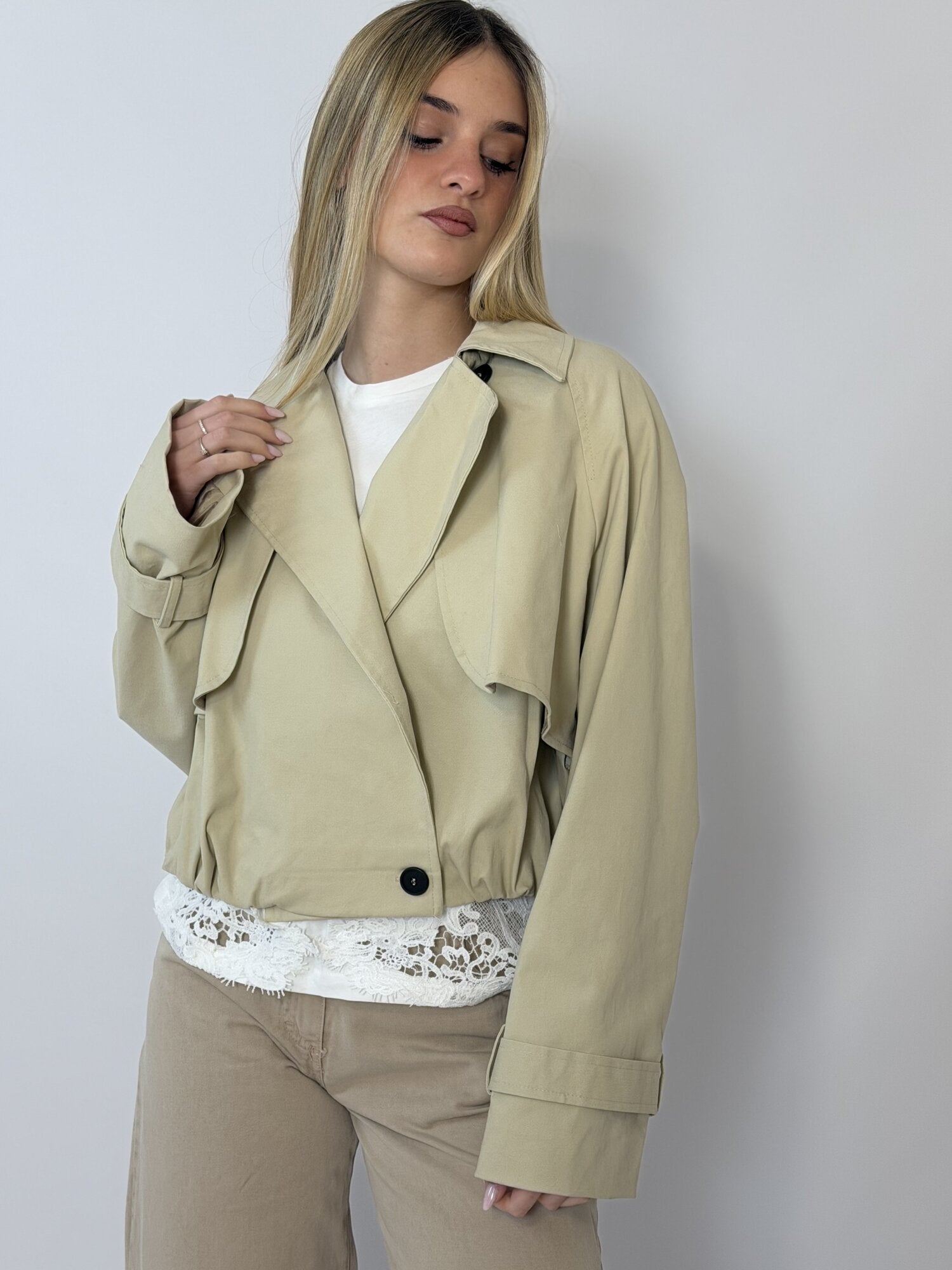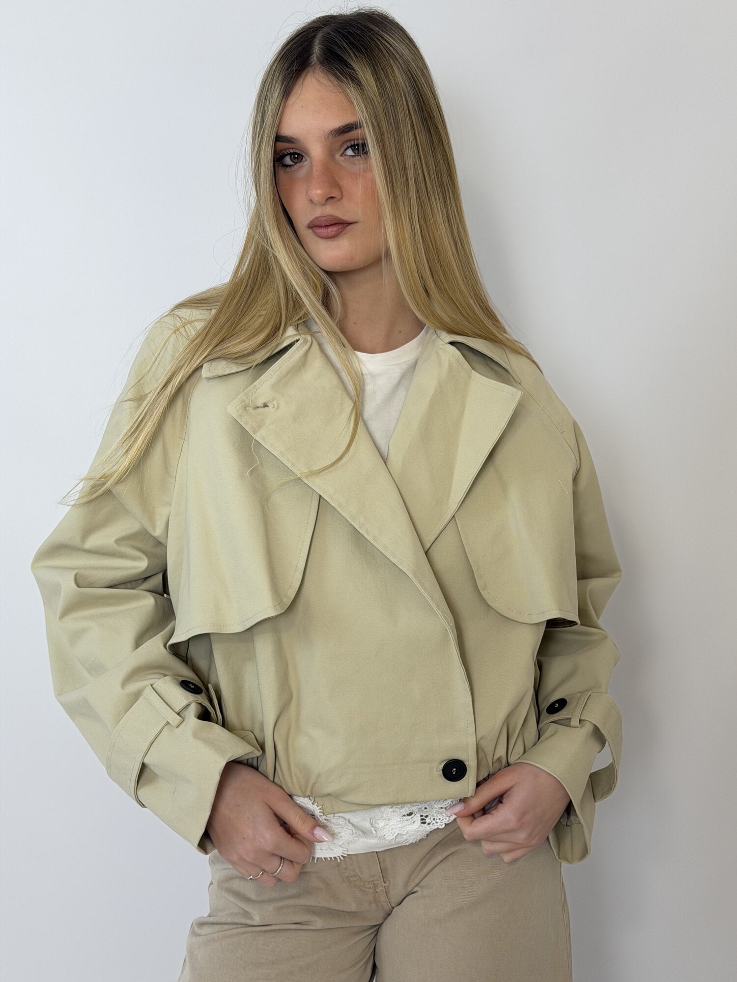 Trench Corto Beige di Haveone. Trench corto dal design moderno e linea morbida, caratterizzato da vestibilità ampia e struttura leggera. Il modello presenta rever classico e dettaglio mantellina frontale che richiama lo stile trench tradizionale in chiave contemporanea.