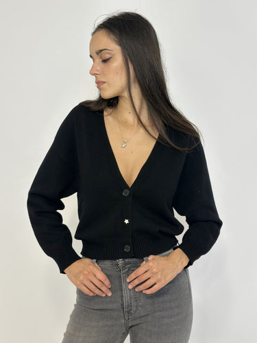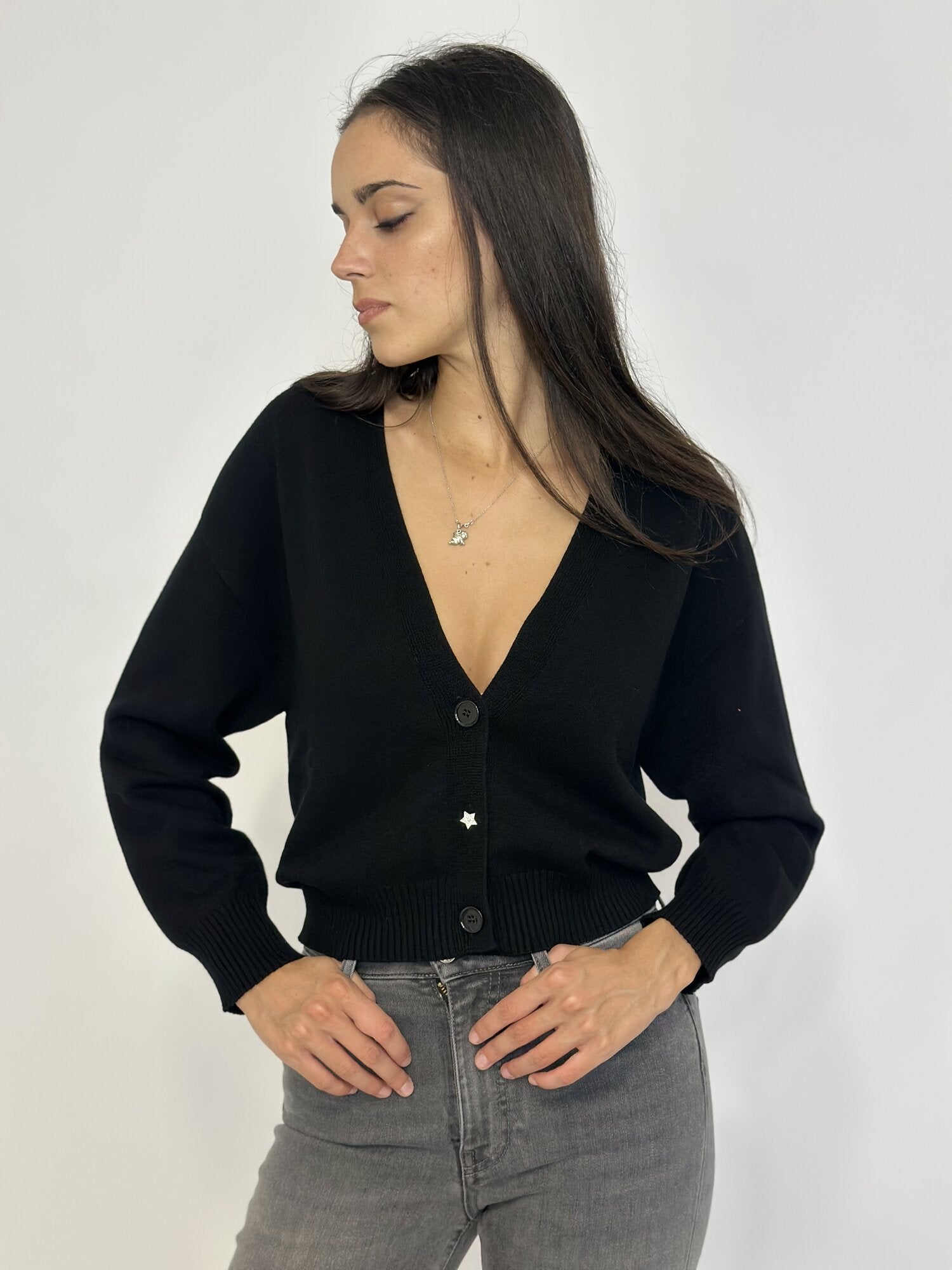 Cardigan bottone stella nero di Vicolo. Cardigan in maglia con scollo a V e maniche lunghe. Dettaglio bottone a forma di stella e vestibilità corta e morbida. Disponibile nel colore bordeaux, nero e moro.