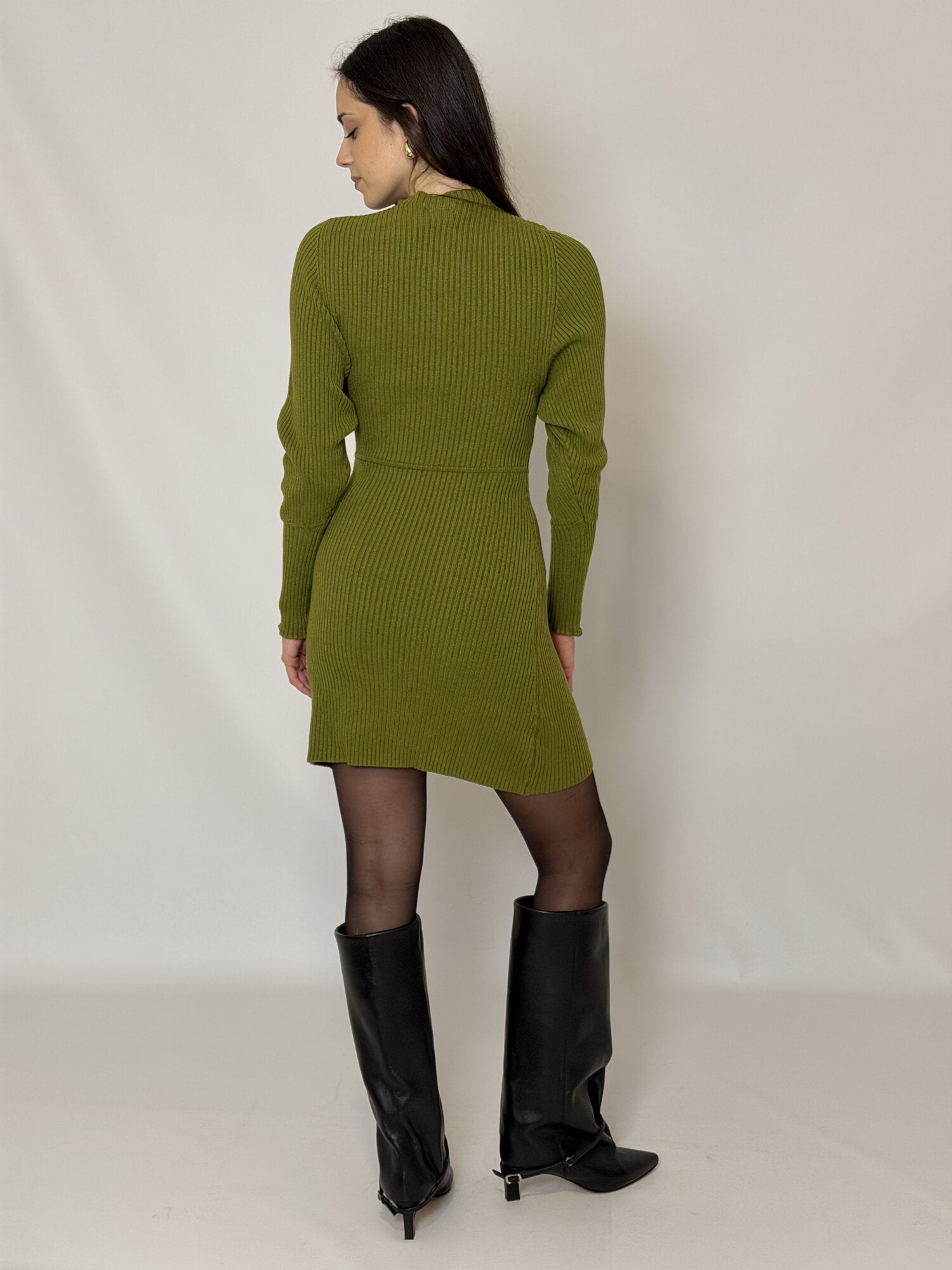 Abito Corto Costine Oliva di Vicolo. Abito in maglia a costine, modello corto con mezzo collo e gonna a ruota. Taglia unica. Disponibile in nero, moro, bordeaux e verde oliva.