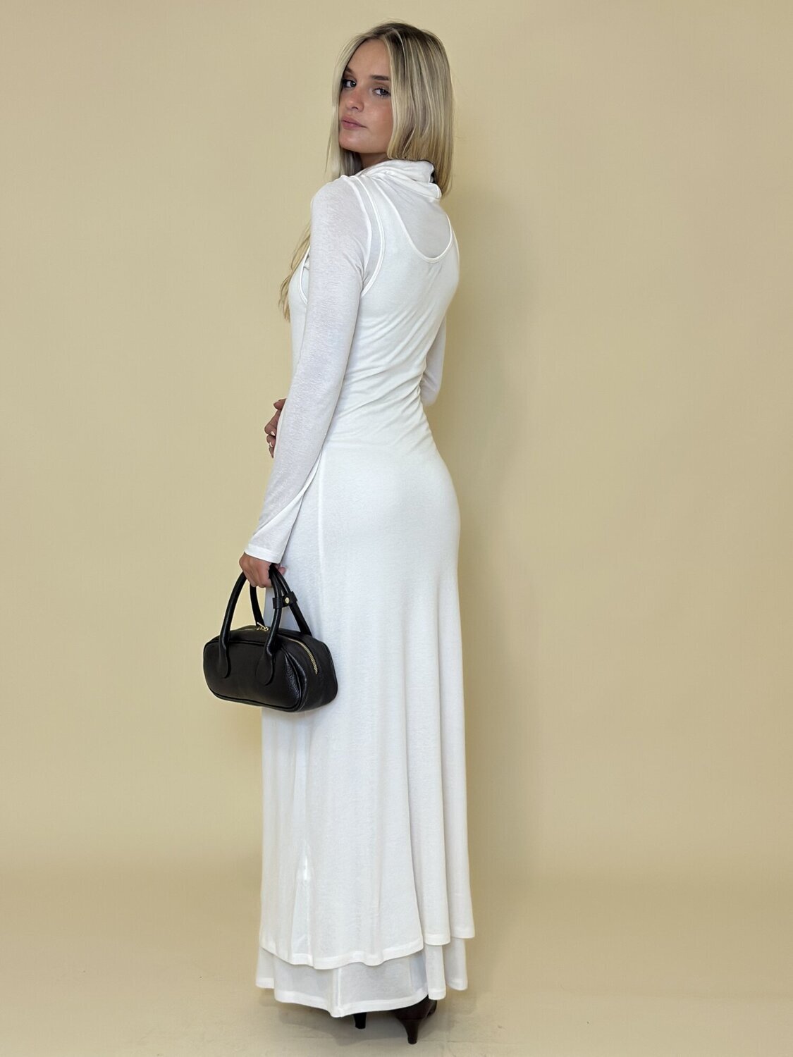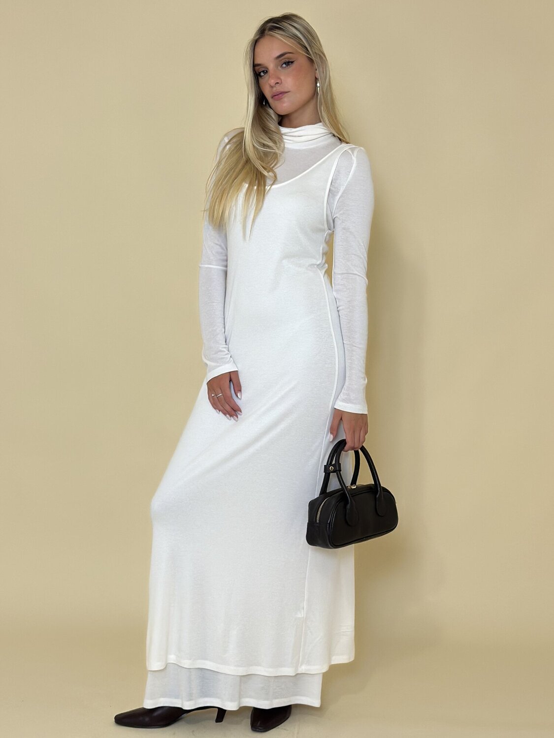 Abito Lungo Combinato Panna di Eleh. Abito lungo in misto tencel e lana dal fit aderente. Abito sottostante con maniche lunghe e collo alto drappeggiato. Abito superiore con scollo ampio tondo e bretelle. Disponibile in panna.