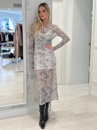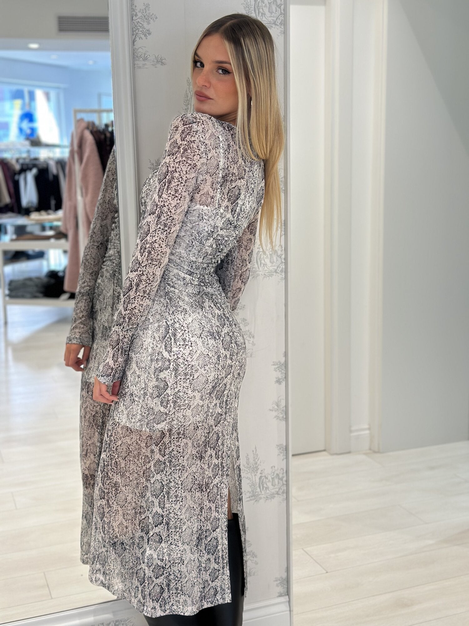 Abito lungo Geisha fantasia snake nero di Emme Marella. Abito a maniche lunghe con scollo tondo e drappeggio centrale. Vestibilità aderente. Materiale leggero ed elasticizzato. Disponibile nella fantasia snake sui toni del beige/marrone e grigio/nero .