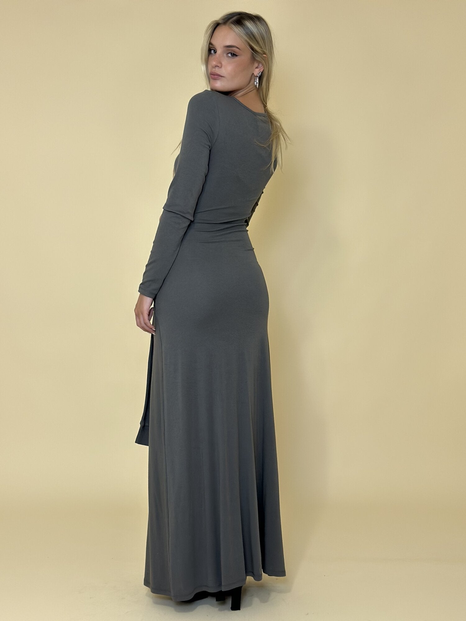 Abito Lungo Nodo Grigio di Eleh. Abito lungo girocollo con maniche lunghe in tessuto stretch dal fit aderente. Gonna morbida. Dettaglio nodo effetto maniche sul davanti con drappeggio. Disponibile in grigio.