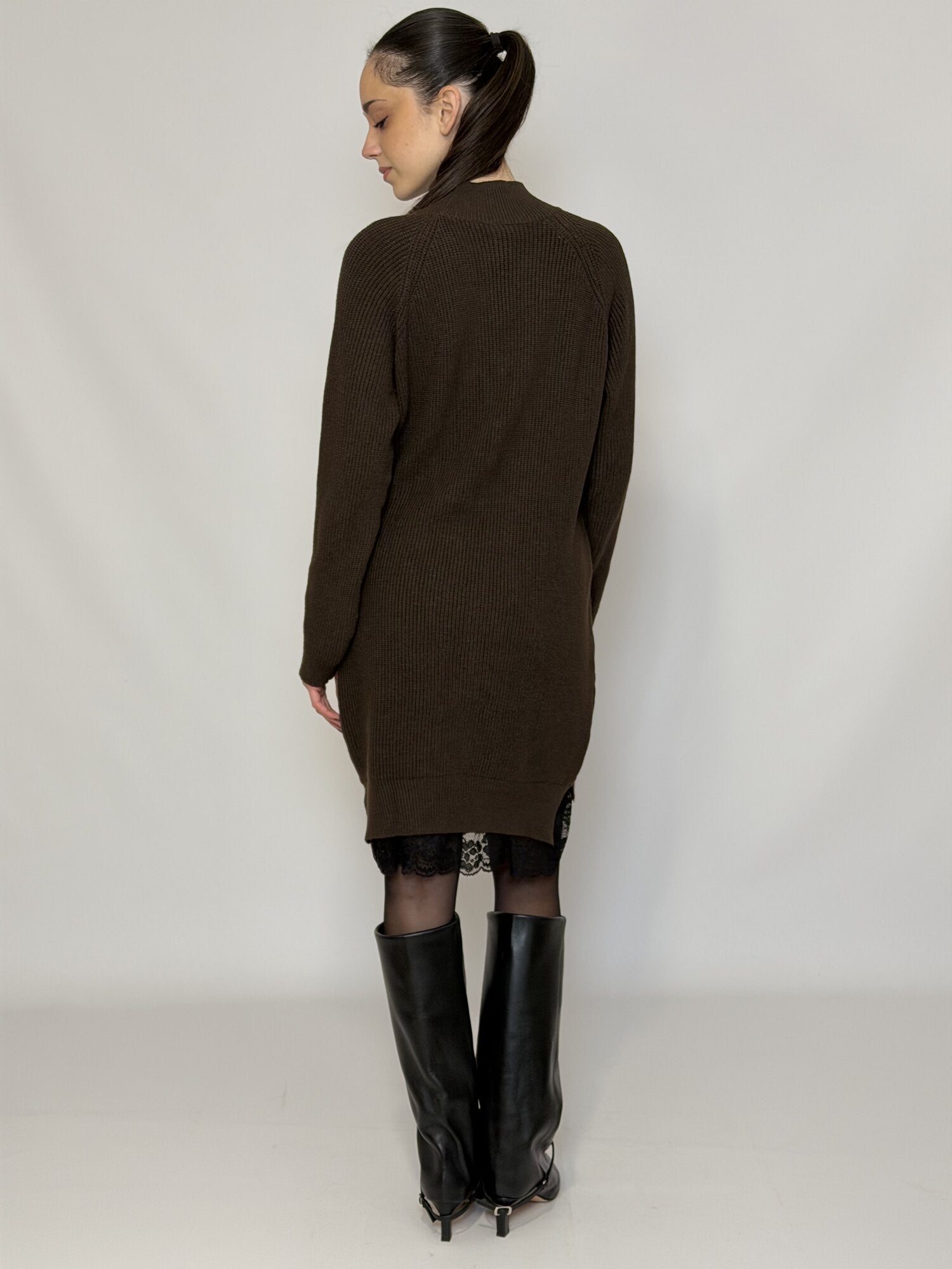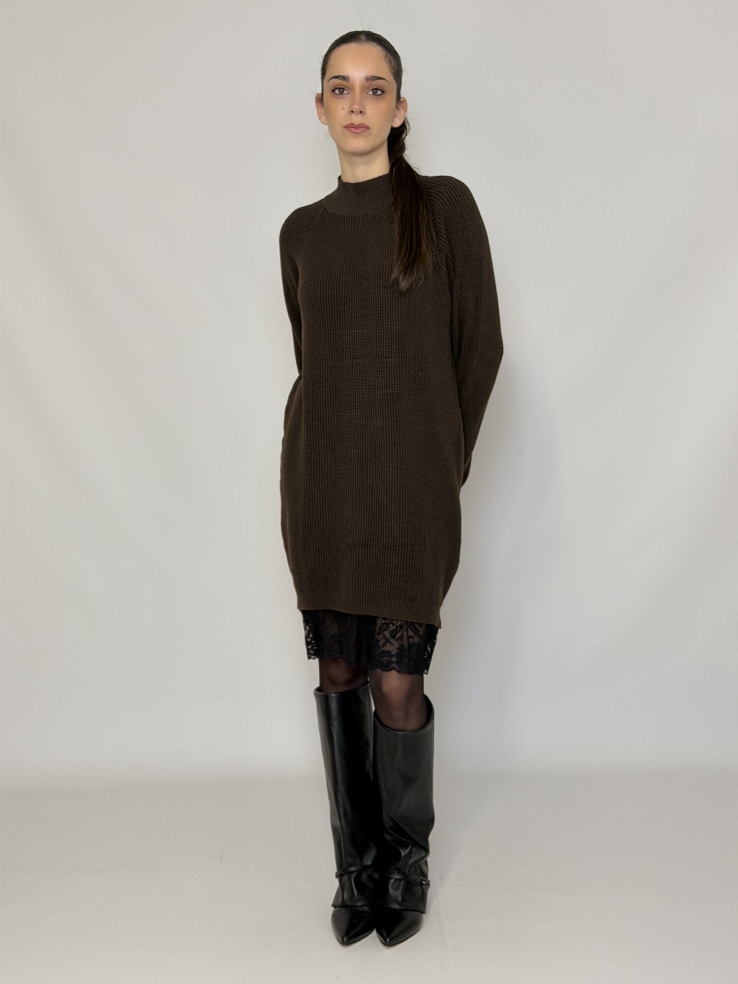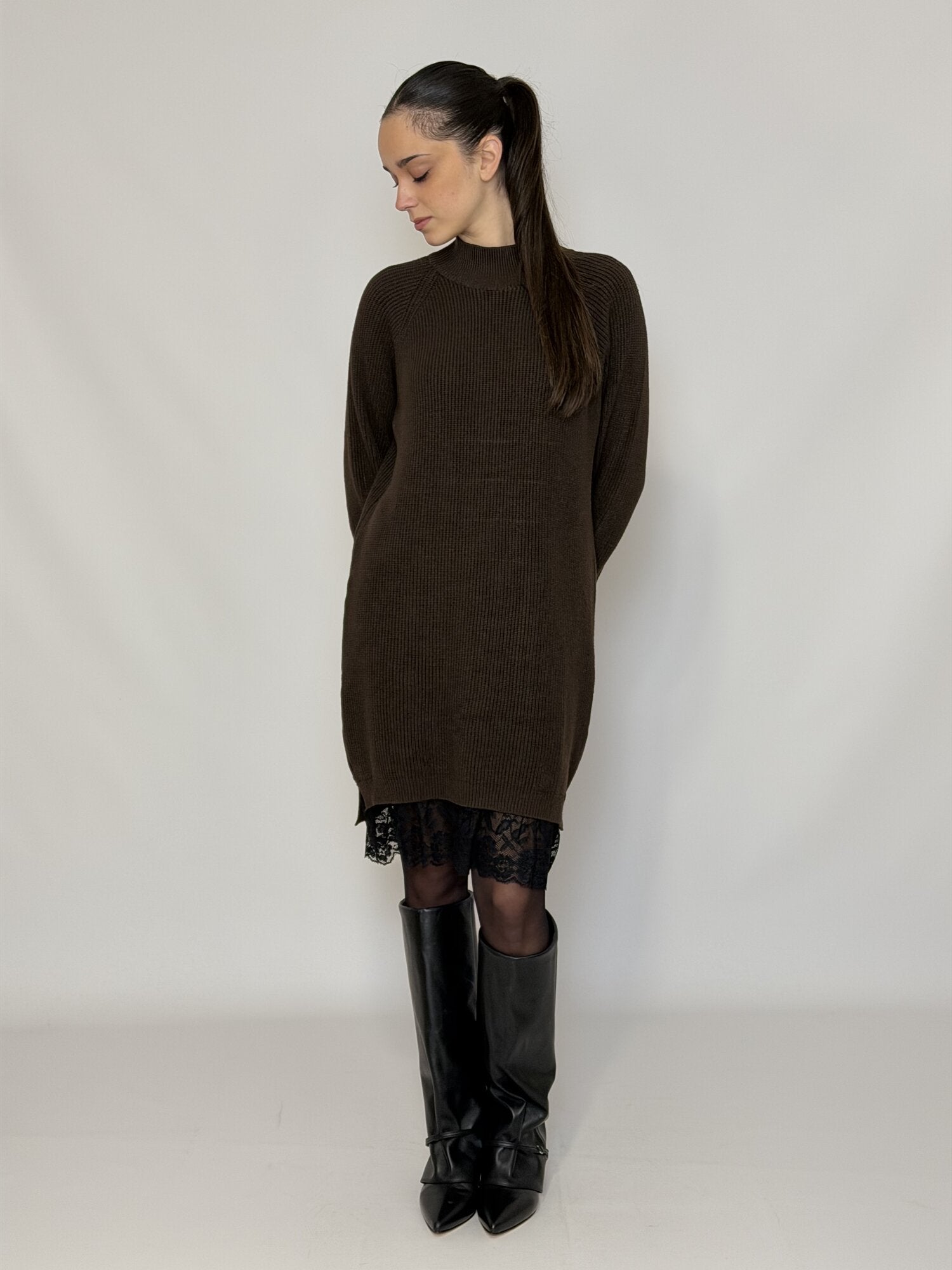 Abito girocollo in maglia a maniche lunghe con pizzo a contrasto nero sull'orlo. Disponibiel in moro e nero.