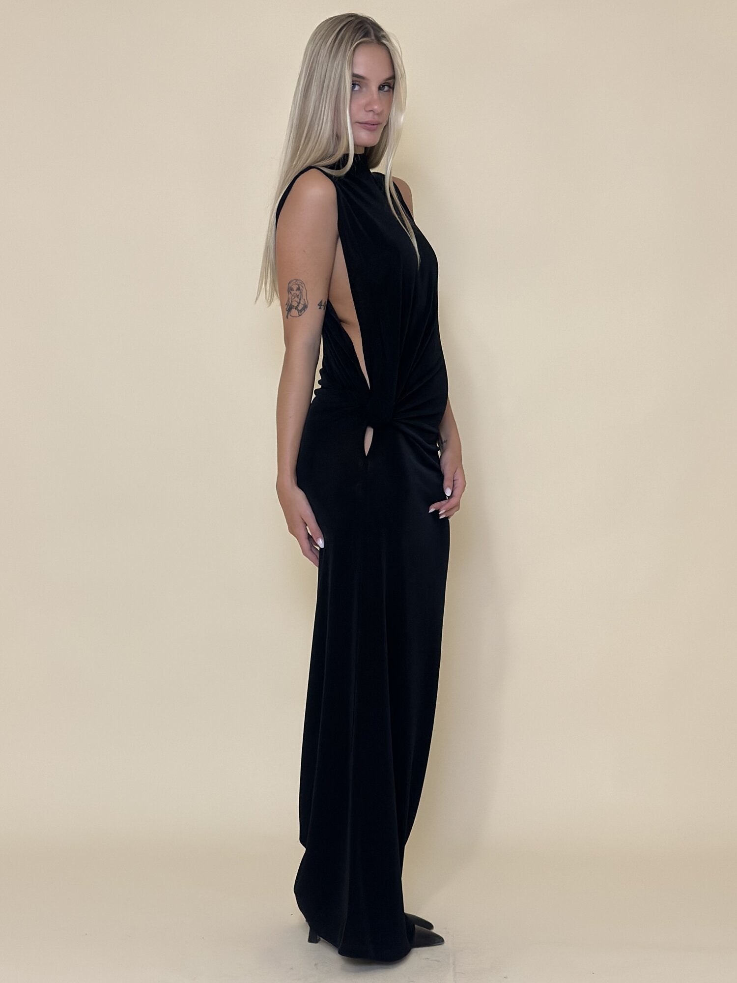 Abito Smanicato Cut Out Nero di Eleh. Abito lungo girocollo in tessuto stretch dalla vestibilità aderente. Smanicato con dettaglio cut out laterale e drappeggio. Disponibile in nero.