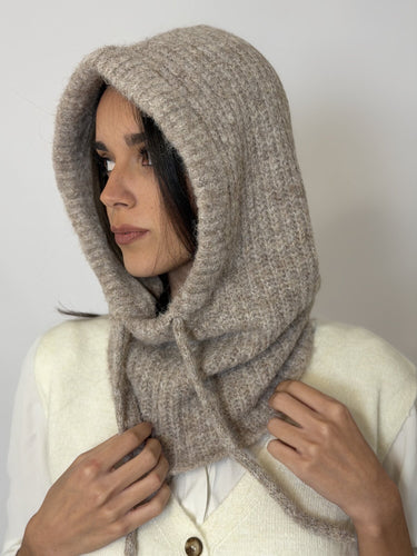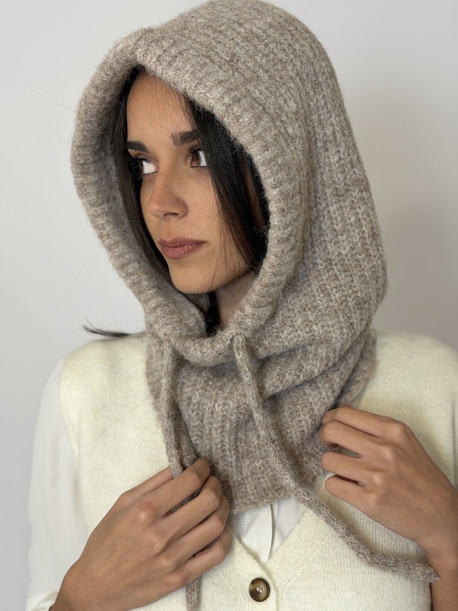 Balaclava Samourai tortora di Grace & Mila. Passamontagna lavorato a maglia a coste con coulisse. Disponibile in tortora.