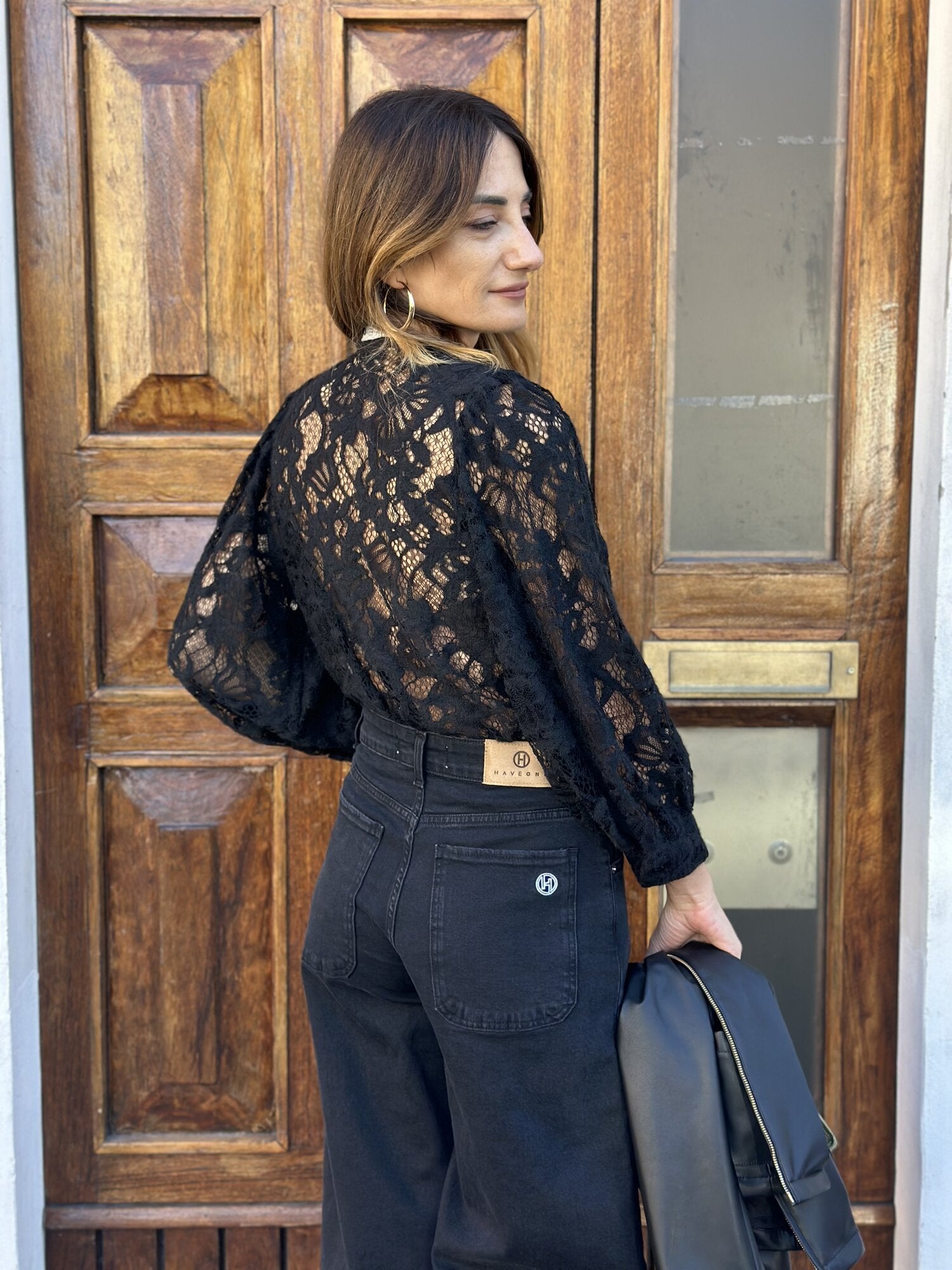 Body blusa a incrocio in pizzo nero di HAVEONE. Body con scollo a V incrociato e maniche lunghe con polsini. Dettaglio in vita. Vestibilità aderente. Materiale in pizzo. Disponibile nel colore nero e panna.