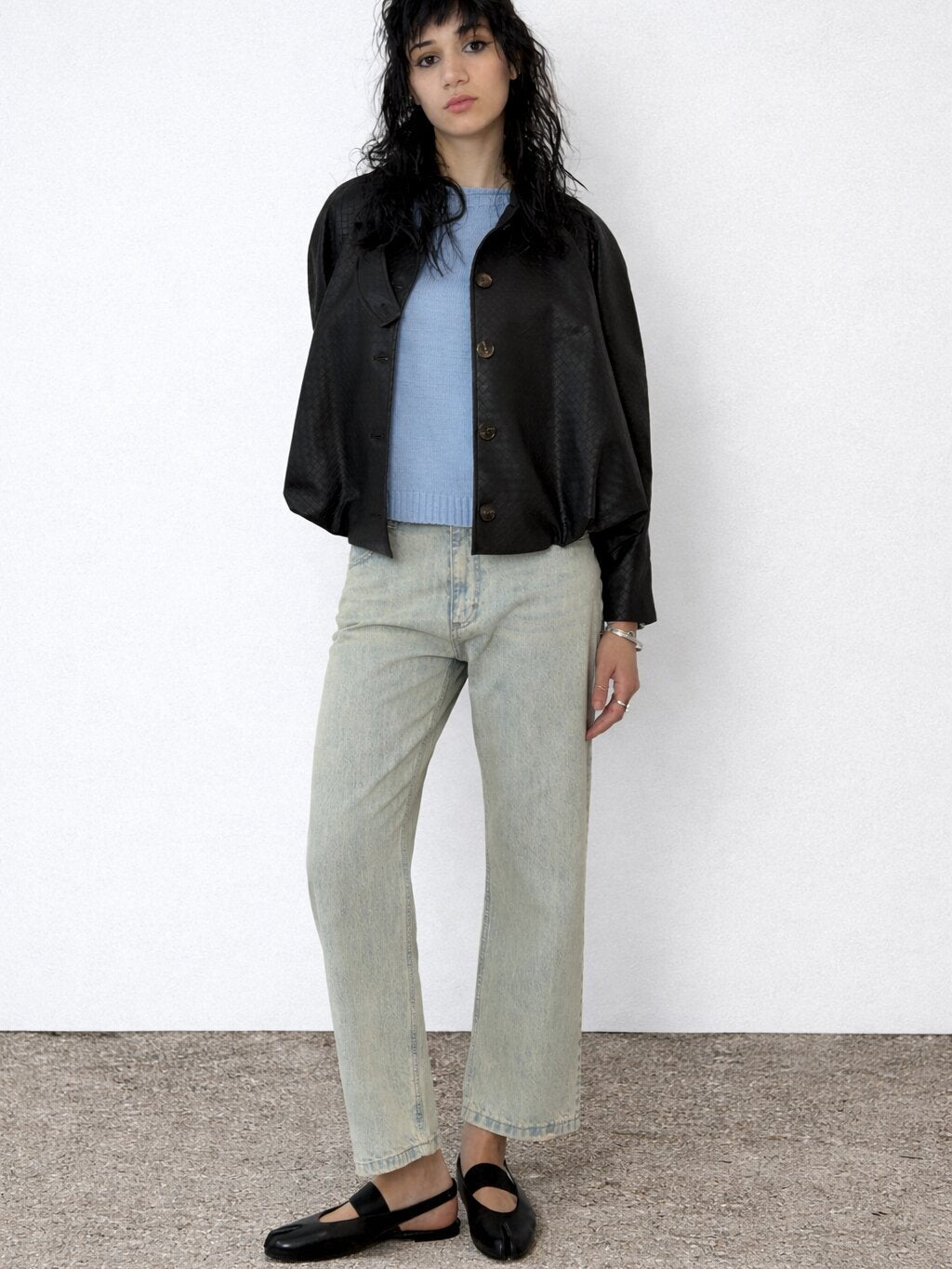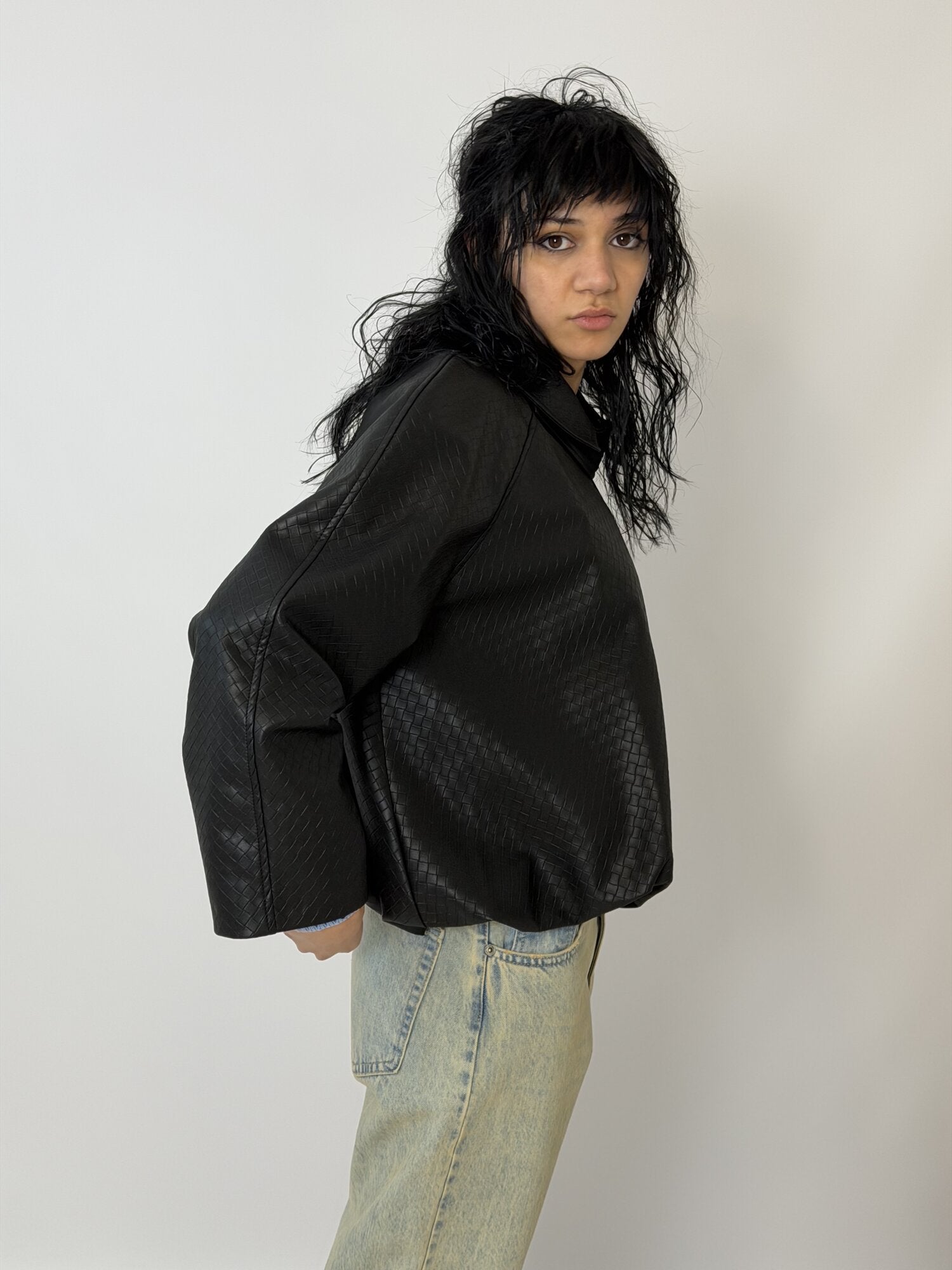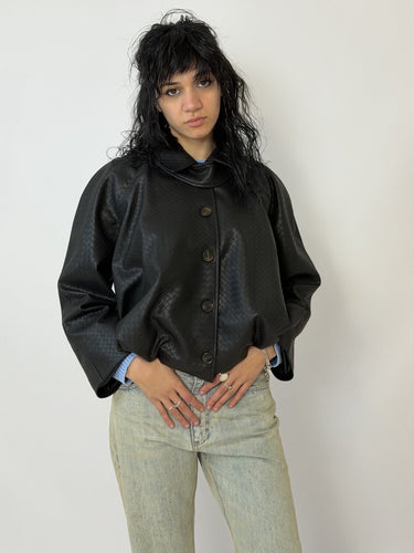 Bomber Intrecci Nero di Tensione In. Bomber che sposta tutto sul volume e sulla materia. La superficie intrecciata crea una texture continua che assorbe la luce invece di rifletterla in modo uniforme.