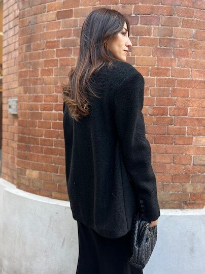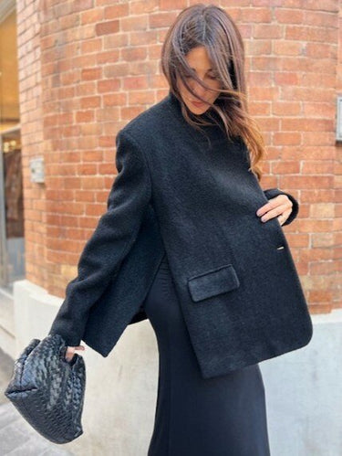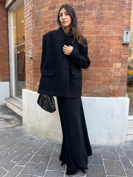Cappotto Bouclé Nero di Eleh. Cappotto corto in tessuto boucle con abbottonatura frontale e mezzo collo. Dettaglio spacco laterale. Foderato. Disponibile in nero.