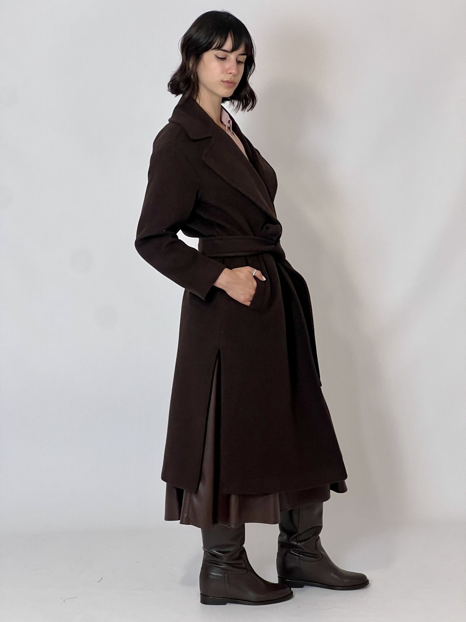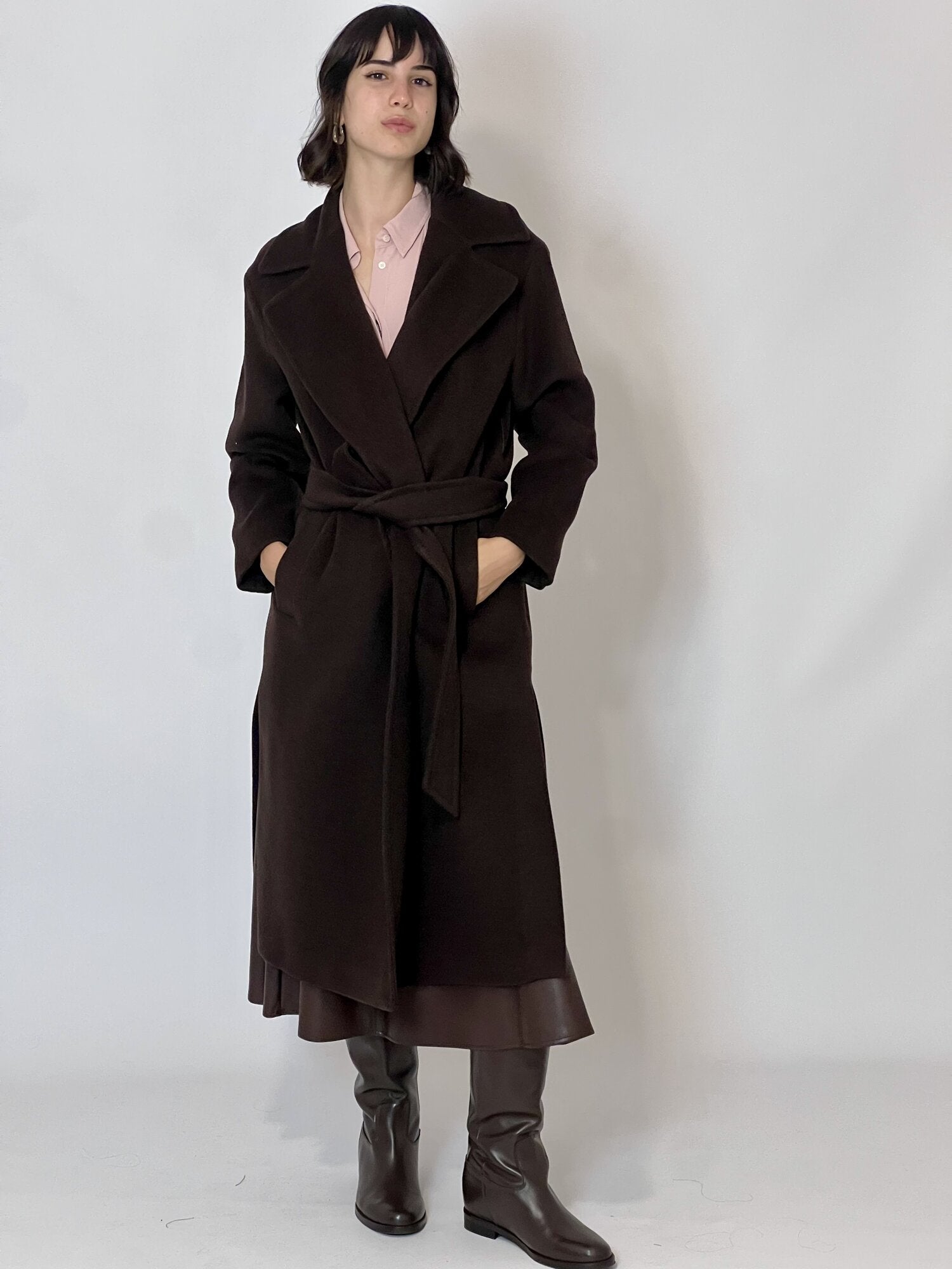 Cappotto con fusciacca Cadmio Moro di Emme di Marella. Cappotto in panno doppio unito, con fodera interna ed etichetta Manteco. Fit dritto. Scollo con rever. Chiusura doppiopetto con cintura. Spacchi laterali combaciati e tasche a filetto. Disponibile in moro.