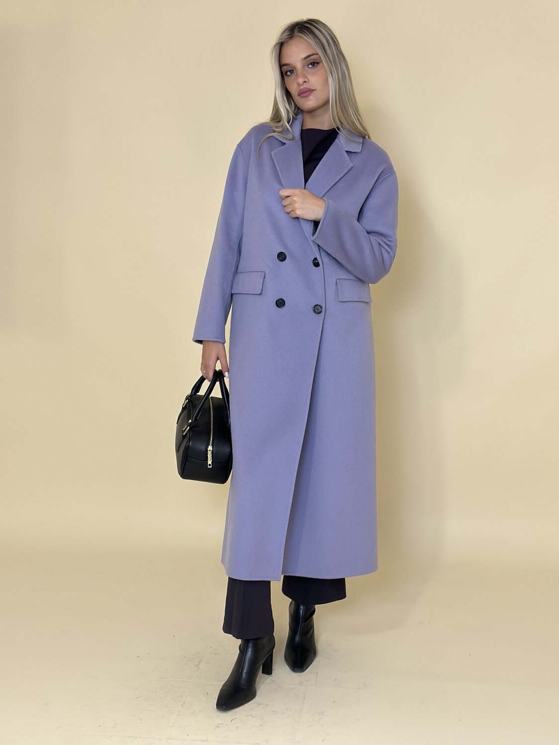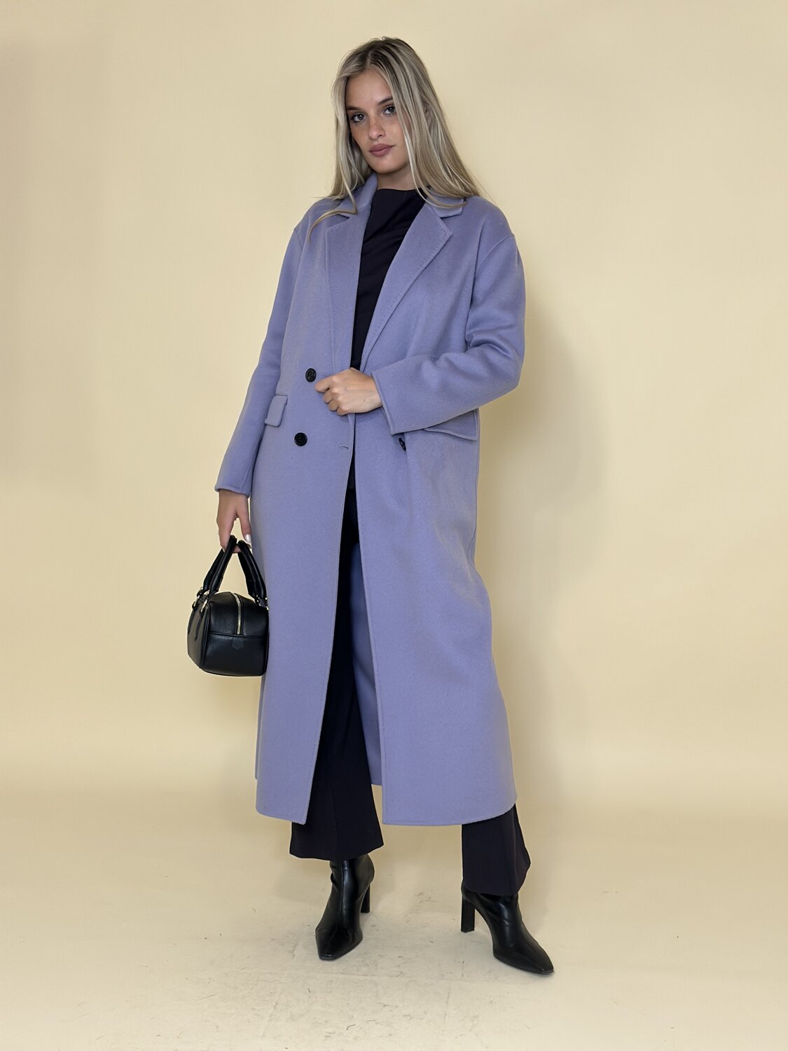 Cappotto doppiopetto lilla di Meimei J. Cappotto a media lunghezza con ampio collo a revers e abbottonatura frontale. Tasche laterali applicate. Vestibilità morbida e dritta. Tessuto morbido e caldo. Disponibile in lilla e cammello.