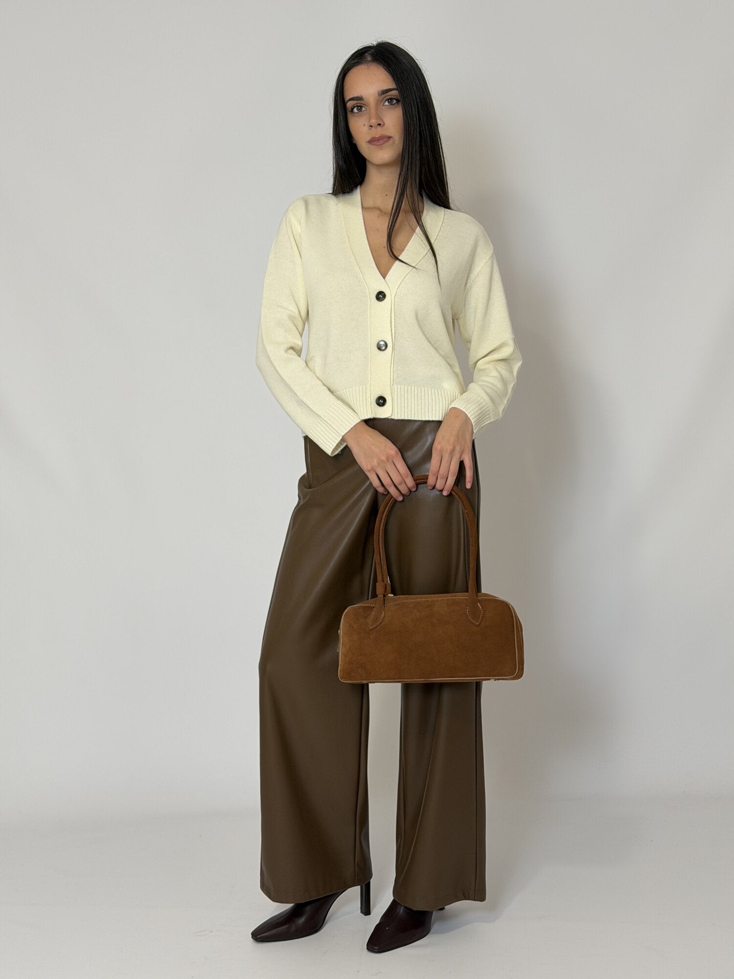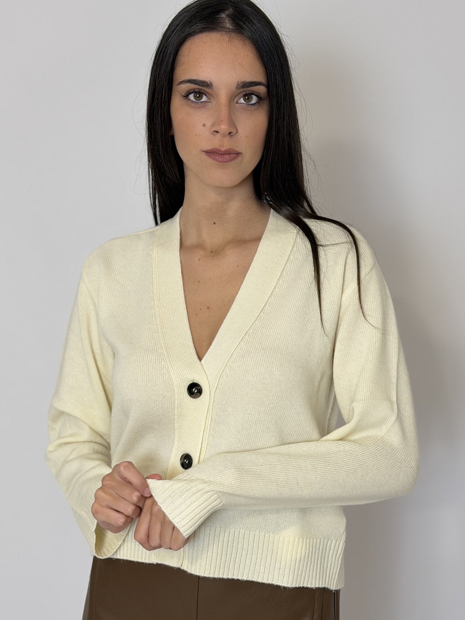 Cardigan Blazer panna di Emme Marella. Cardigan in filato misto lana dal fit dritto. Scollo a V con spalla scesa. Chiusura con bottoni in simil corno. Fondo e polsi lavorati a costine. Disponibile in blu notte.