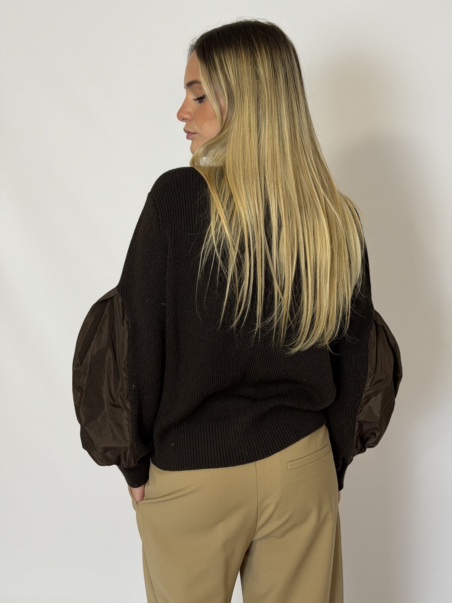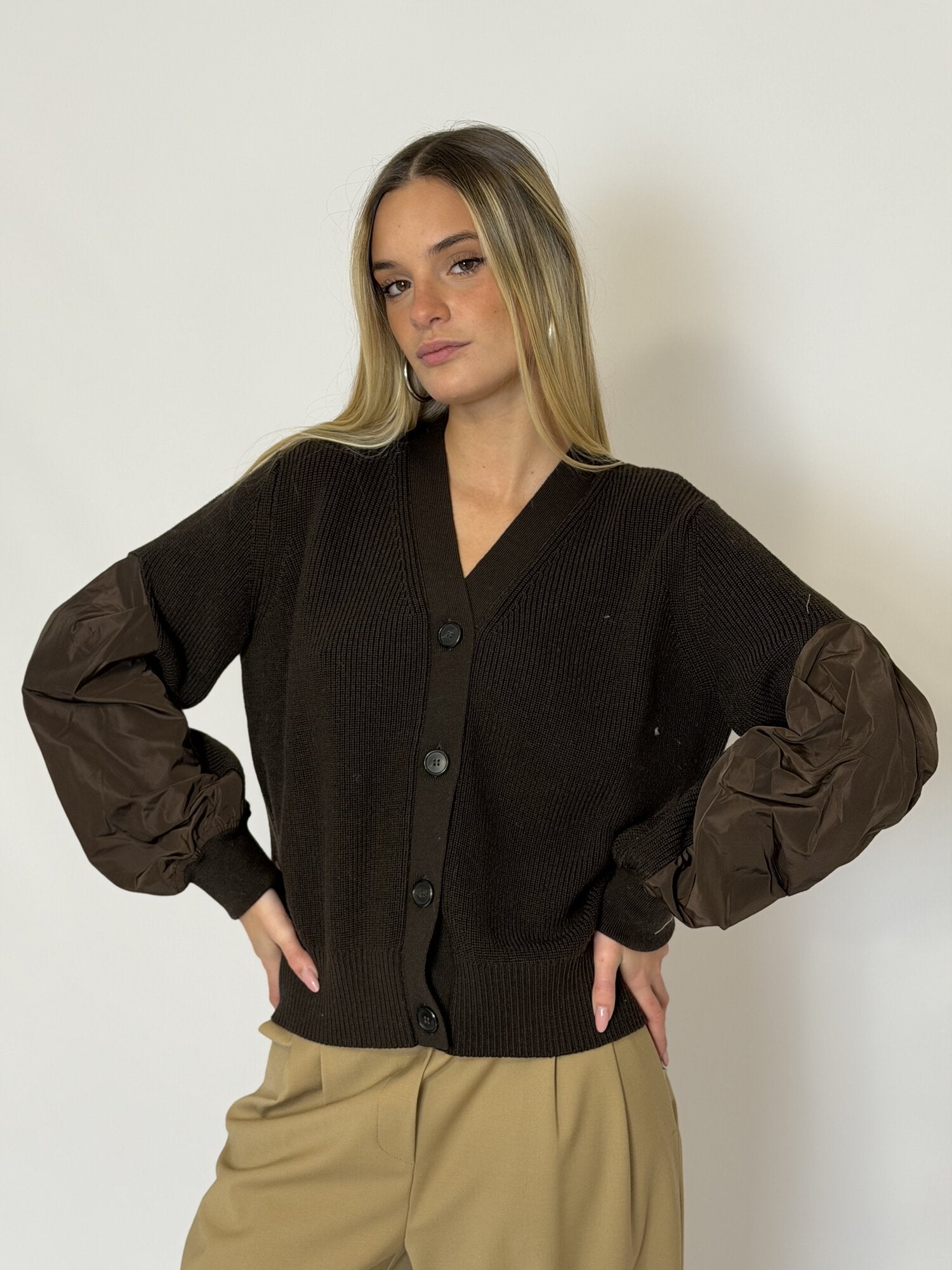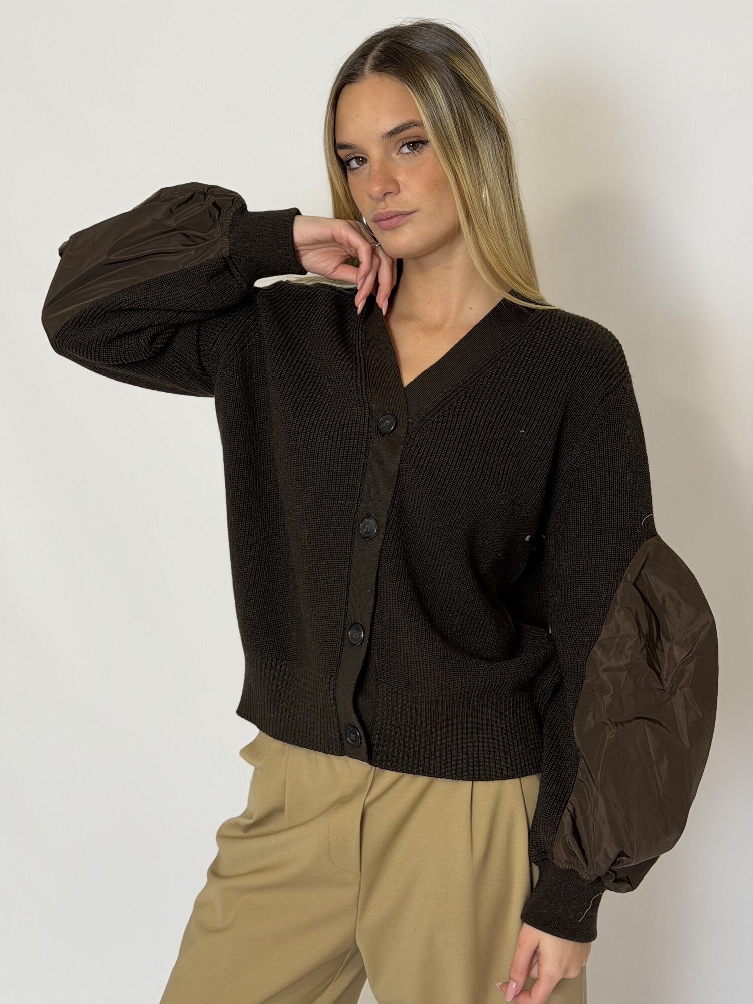 Cardigan Maniche Taffetà Moro di Meimei J. Cardigan a costine con scollo a V e maniche lunghe con inserti in taffetà. Chiusura con bottoni frontali. Disponibile in moro.