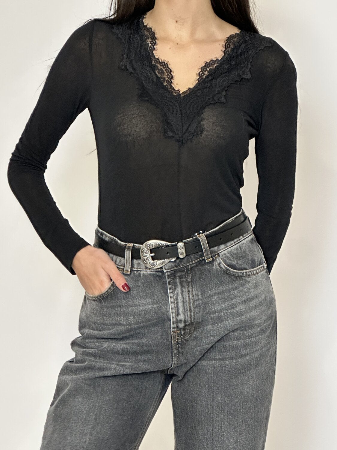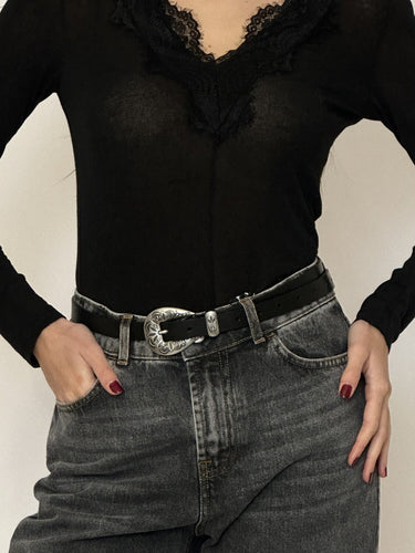 Cintura in pelle liscia color nero con fibbia western argentata incisa. Cintura in pelle liscia di colore nero. Presenta una fibbia di metallo argentato. Design a ovaloide/floreale in stile western, con incisioni decorative.