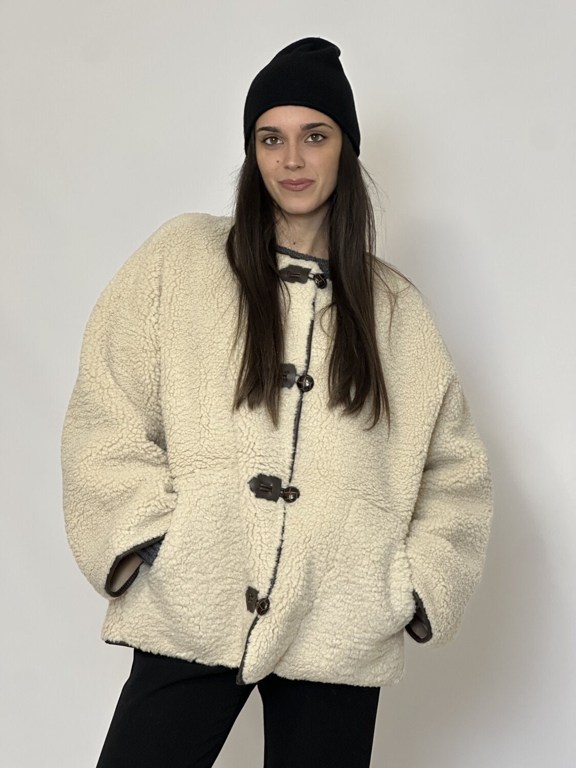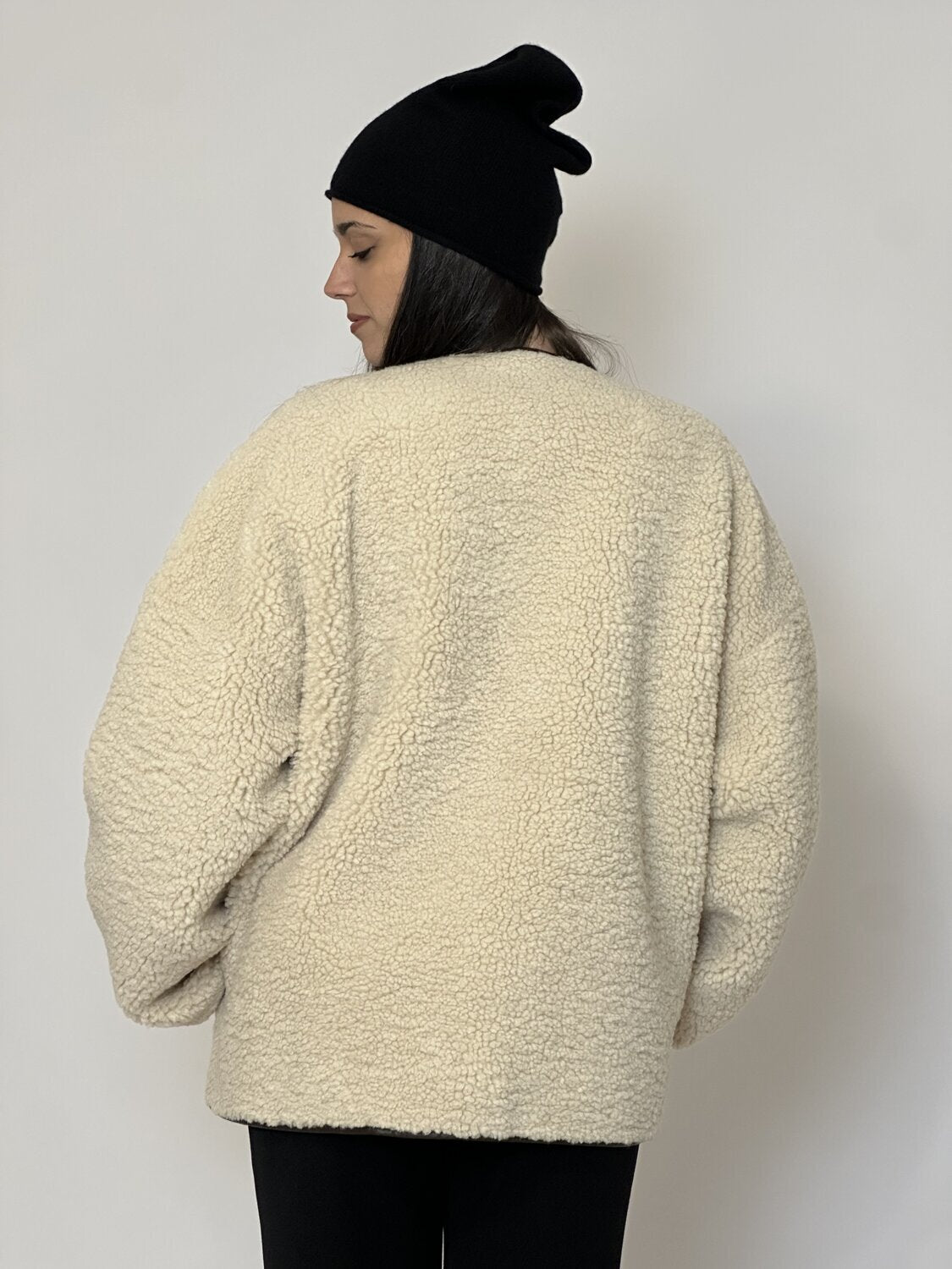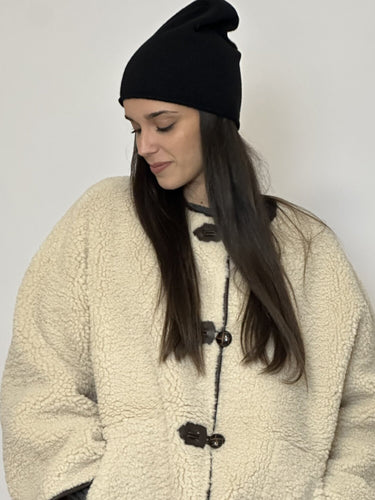 Cuffia Riforma nero di Emme Marella. Cuffia maglia rasata con orlo a taglio vivo leggermente arrotolato. Caldo e avvolgente. Disponibile in nero, grigio, grigio chiaro, cammello.