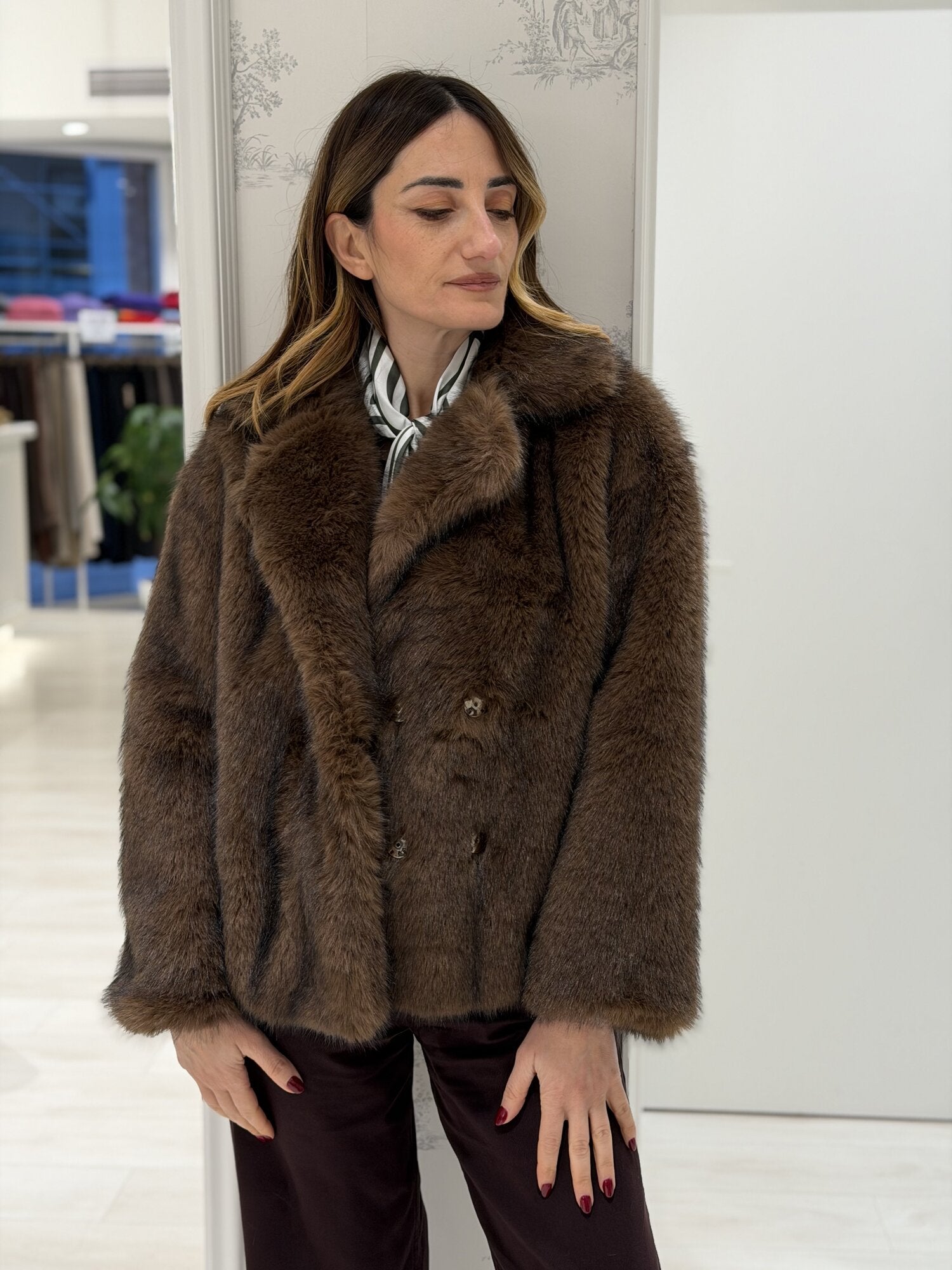 Ecopelliccia Marrone con Foulard incluso di Souvenir a maniche lunghe, collo a revers, chiusura con bottoni a pressione, foderata. Disponibile in marrone.