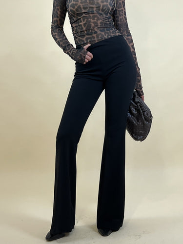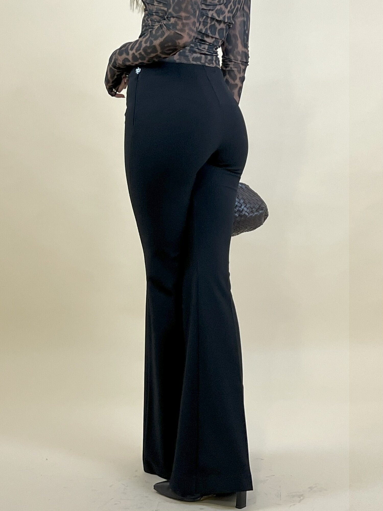 Flared Sienna Nero di Aniye By. I pantaloni Sienna richiamano le atmosfere disco anni 70. Realizzati in tessuto stretch dalla mano fresca, si caratterizzano per la piega stirata centrale e il taglio flared che slancia la silhouette e li rende comodi da indossare from day to night. Chiusura con zip sul fianco, tirazip logata. Disponibili in nero e bordeaux.